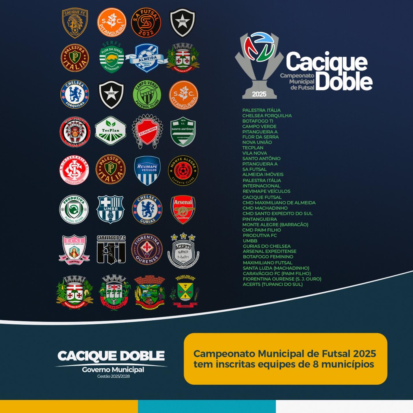O Campeonato Municipal de Futsal 2025 de Cacique Doble promete ser um dos maiores eventos esportivos da região. Além das equipes municipais, cidades vizinhas já confirmaram presença e participação na competição: além de Cacique Doble, estão inscritas equipes de Santo Expedito do Sul, Tupanci do Sul, Barracão, São José, Maximiliano de Almeida, Machadinho e Paim Filho. Ao todo, são 33 times inscritos na competição.