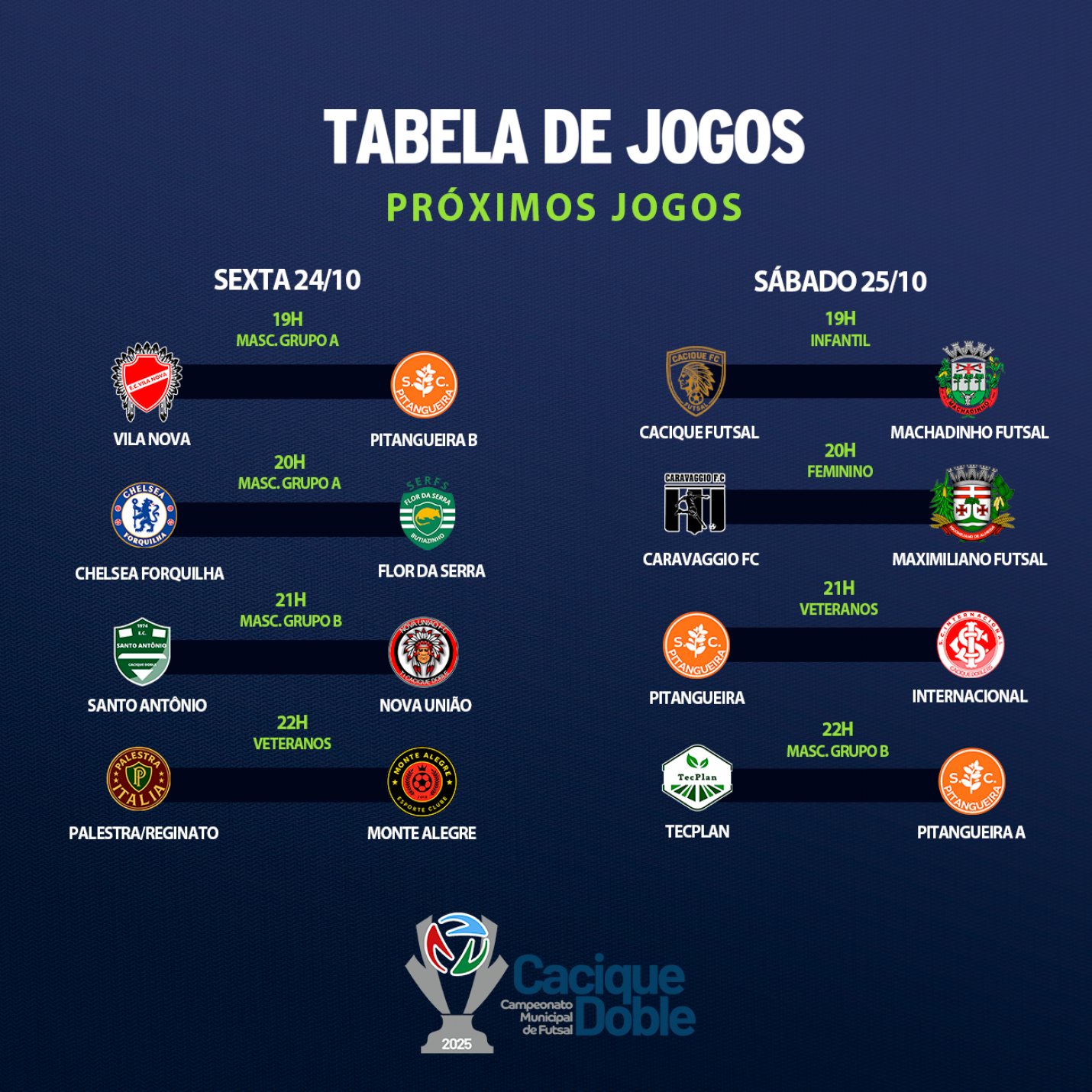 Nesta sexta-feira, dia 24, a rodada inicia às 19h, com o confronto entre Vila Nova x Pitangueira B (Masculino – Grupo A). Em seguida, às 20h, jogam Chelsea Forquilha x Flor da Serra (Masculino – Grupo A). A noite segue com Santo Antônio x Nova União (Masculino – Grupo B), às 21h, e encerra com o duelo dos Veteranos: Palestra/Reginato x Monte Alegre, às 22h.