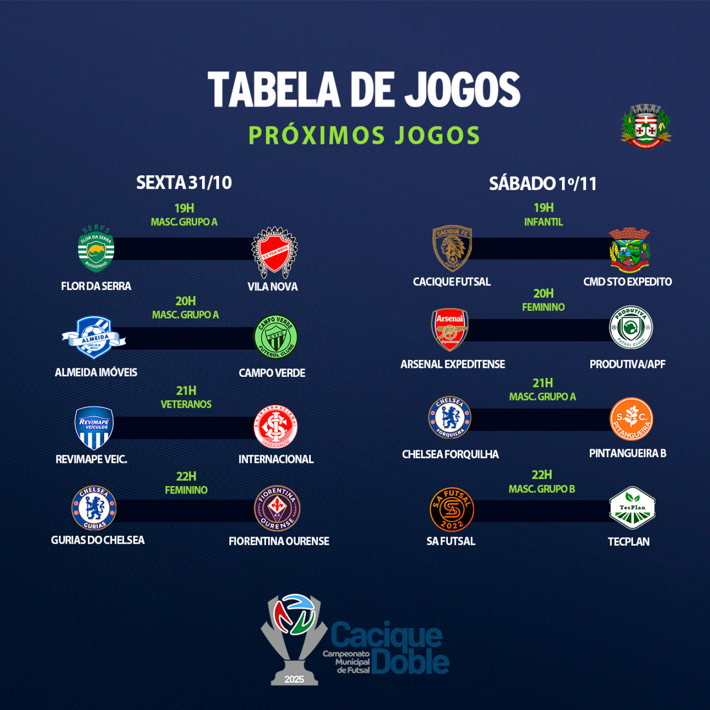 Nesta sexta-feira, dia 31, a rodada inicia às 19h, com o confronto entre Flor da Serra e Vila Nova, pelo Masculino Grupo A. Logo depois, Almeida Imóveis enfrenta o Campo Verde, também pelo Masculino Grupo A, seguido pela disputa entre Revimape Veículos e Internacional, na categoria Veteranos. Encerrando a noite, o público poderá acompanhar o duelo feminino entre Gurias do Chelsea e Fiorentina Ourense.