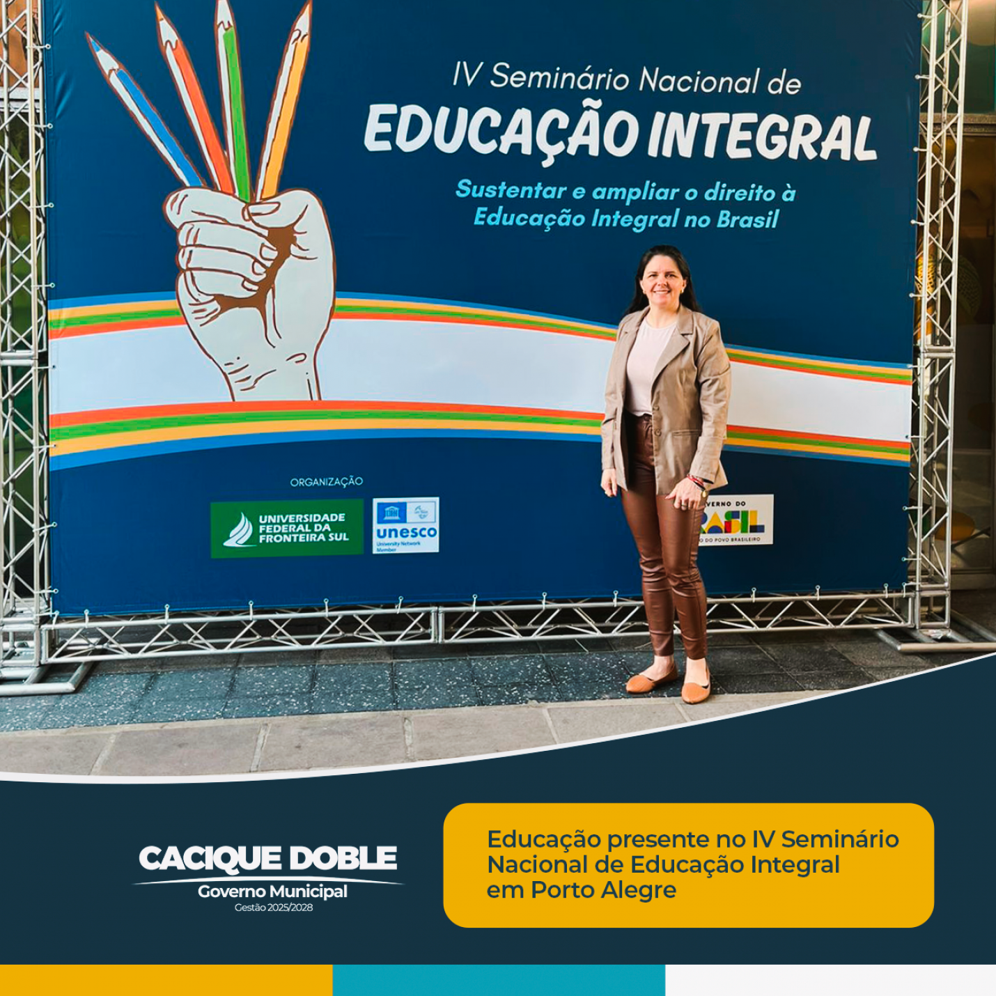 A fim de buscar o aprimoramento das práticas educacionais e uma formação mais completa, cidadã e transformadora para seus alunos, a responsável interina pela Secretaria Municipal de Educação, Suzana Mezzalira, está representando o município de Cacique Doble no IV Seminário Nacional de Educação Integral, realizado no Salão de Atos da Universidade Federal do Rio Grande do Sul (UFRGS), em Porto Alegre, nestes dias 03, 04 e 05 de novembro.
