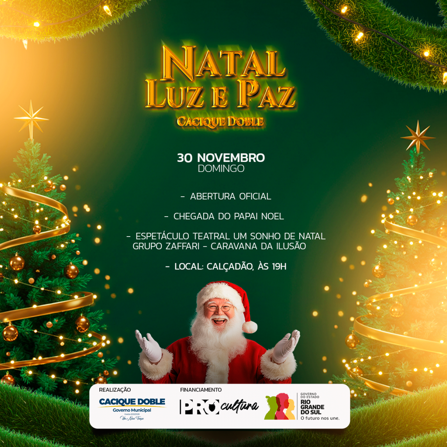 O espírito natalino já começa a tomar conta de Cacique Doble, e neste ano a magia promete encantar ainda mais corações. O Governo Municipal de Cacique Doble convida toda a comunidade para participar da abertura oficial do Natal Luz e Paz 2025, que acontecerá no domingo, dia 30 de novembro, a partir das 19h, no Calçadão.