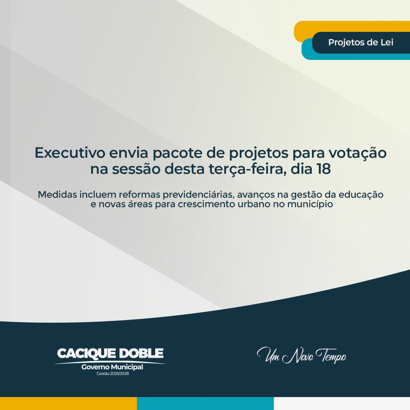 O Executivo Municipal de Cacique Doble encaminhou um pacote de projetos de lei para serem votados na sessão desta terça-feira, 18 de novembro. As propostas tratam de alterações no regime jurídico dos servidores, reorganização da previdência municipal, políticas educacionais e iniciativas direcionadas ao desenvolvimento urbano e regional.