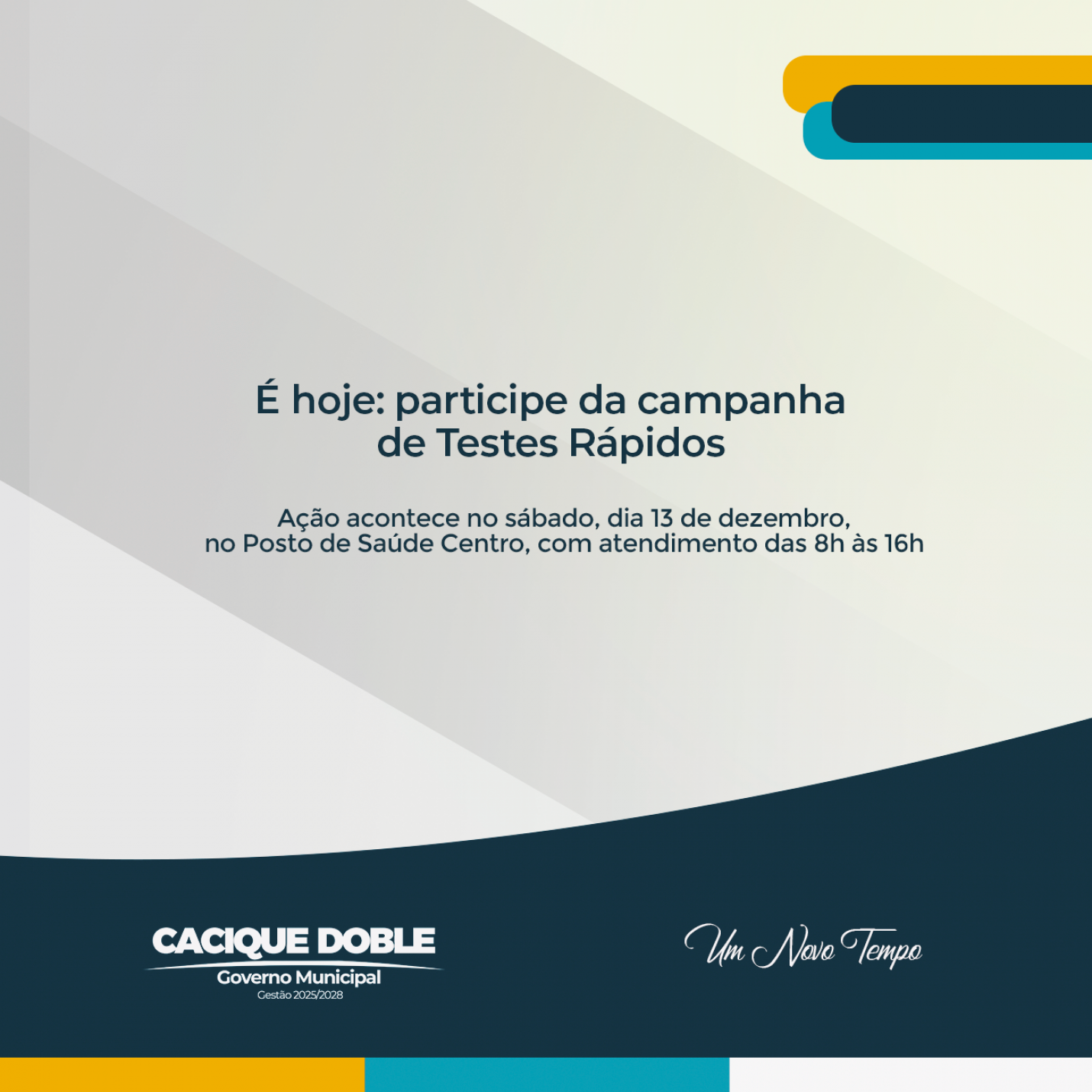 A Secretaria Municipal de Saúde de Cacique Doble reforça o convite à população: é hoje, sábado, 13 de dezembro, a realização da campanha “Uma Gota de Sangue Pode Fazer a Diferença!”, voltada à prevenção e ao cuidado com a saúde. A ação acontece no Posto de Saúde Centro, com atendimento das 8h às 16h, sem fechar ao meio-dia, oferecendo testes rápidos de HIV, Sífilis e Hepatites.