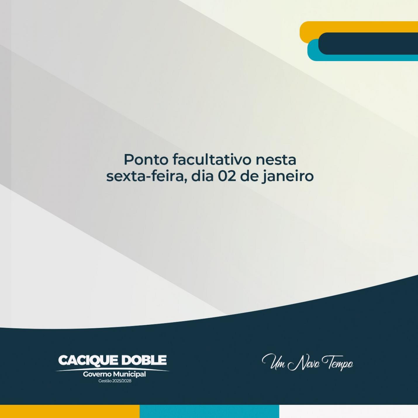 O Governo Municipal de Cacique Doble lembra que não haverá atendimento ao público nesta sexta-feira, dia 02 de janeiro, em virtude do ponto facultativo estabelecido pelo Decreto nº 1.100/2025, publicado em 16 de dezembro de 2025.