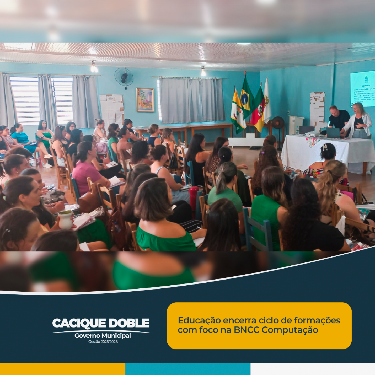 A Secretaria Municipal de Educação de Cacique Doble concluiu, nesta quinta-feira, dia 12 de fevereiro, a série de formações pedagógicas voltadas aos professores da Rede Municipal de Ensino. Ao longo dos encontros, foram promovidas vivências, reflexões e estudos sobre as capacidades a serem desenvolvidas em sala de aula, tornando a ação pedagógica ainda mais consciente, reflexiva, integradora e efetiva, com foco na melhoria dos resultados educacionais.