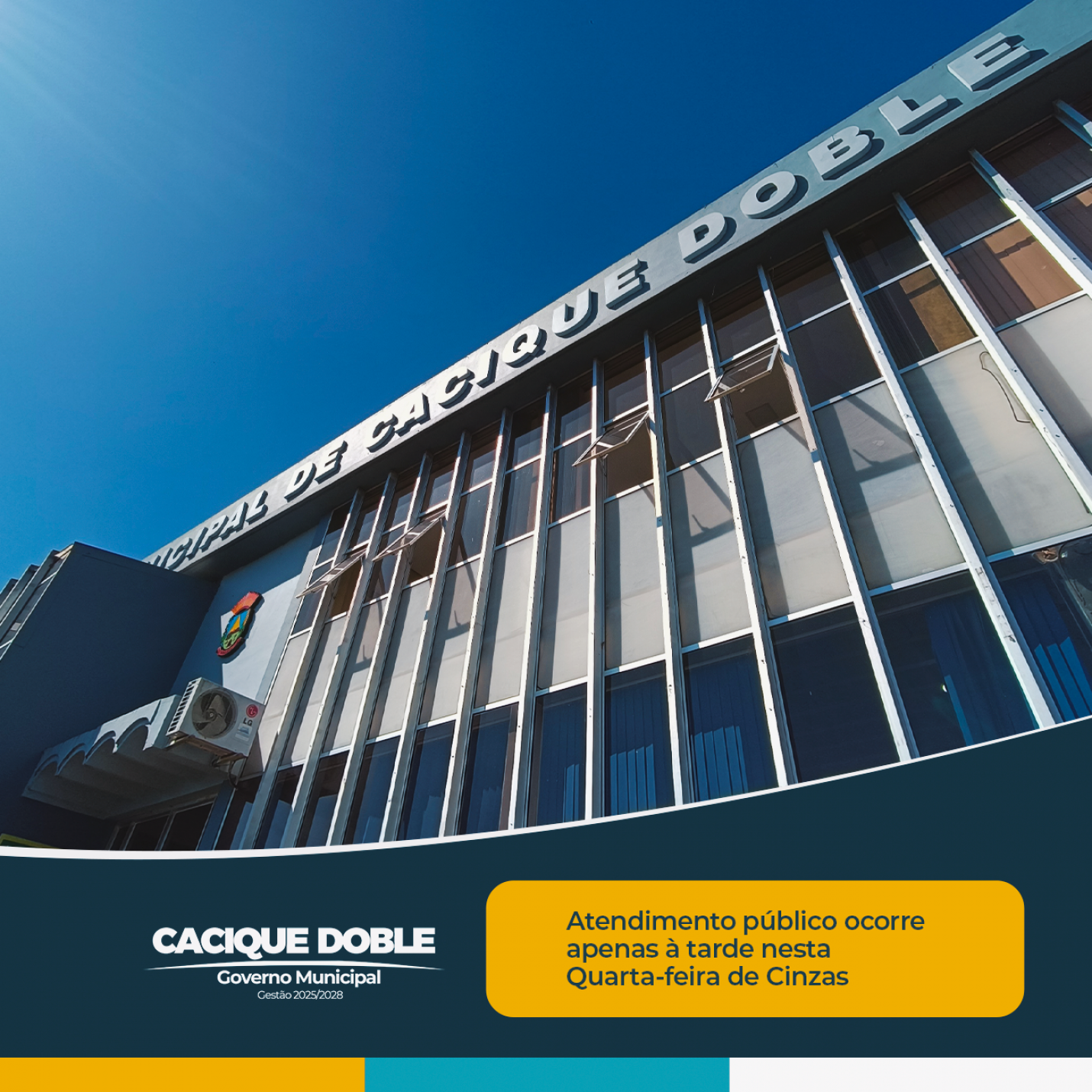O Governo Municipal de Cacique Doble lembra que, em razão do feriado de Carnaval, o expediente nas repartições públicas municipais nesta Quarta-feira de Cinzas, dia 18 de fevereiro, será realizado somente no turno da tarde.
