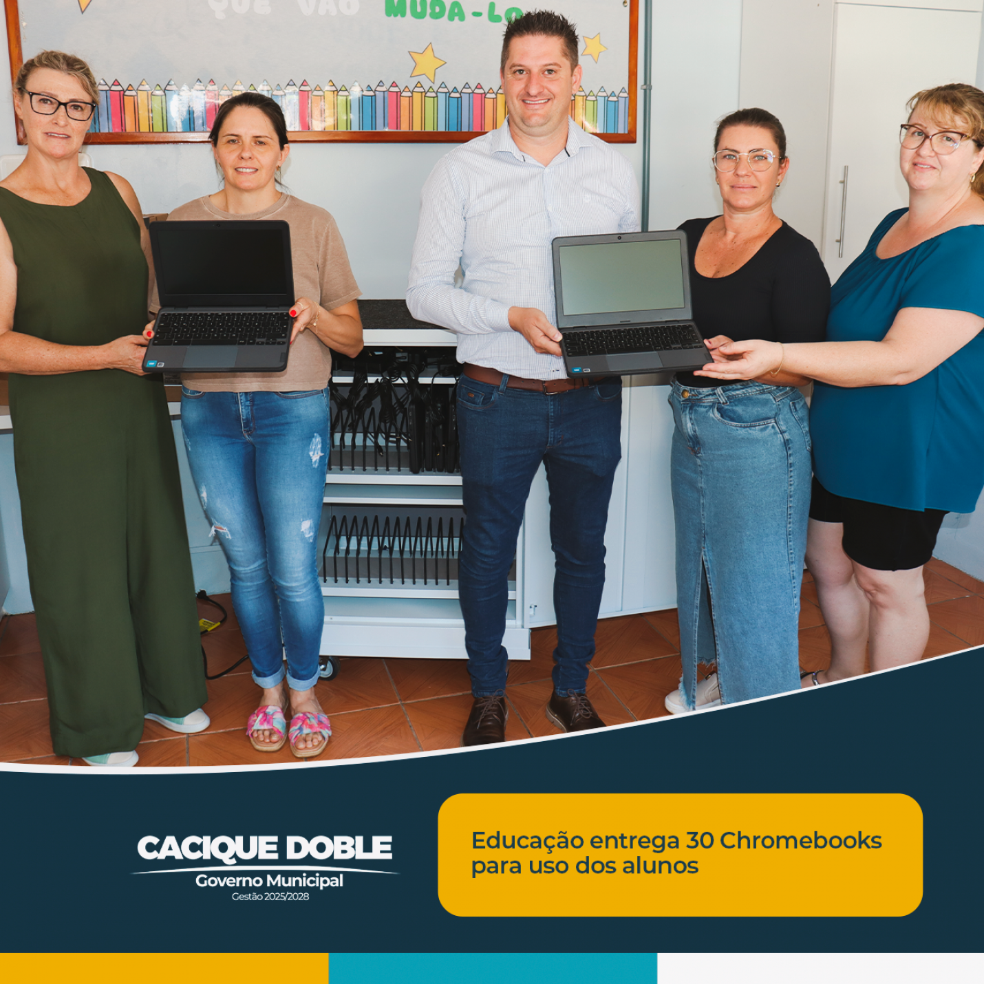 Visando a modernização do ensino e a oferta de melhores condições para o desenvolvimento dos alunos da rede municipal, o Governo Municipal de Cacique Doble por meio da Secretaria de Educação, realizou a entrega de 30 Chromebooks para a Escola Municipal de Ensino Fundamental Professora Ivone Salete Peruzzolo Demartini.