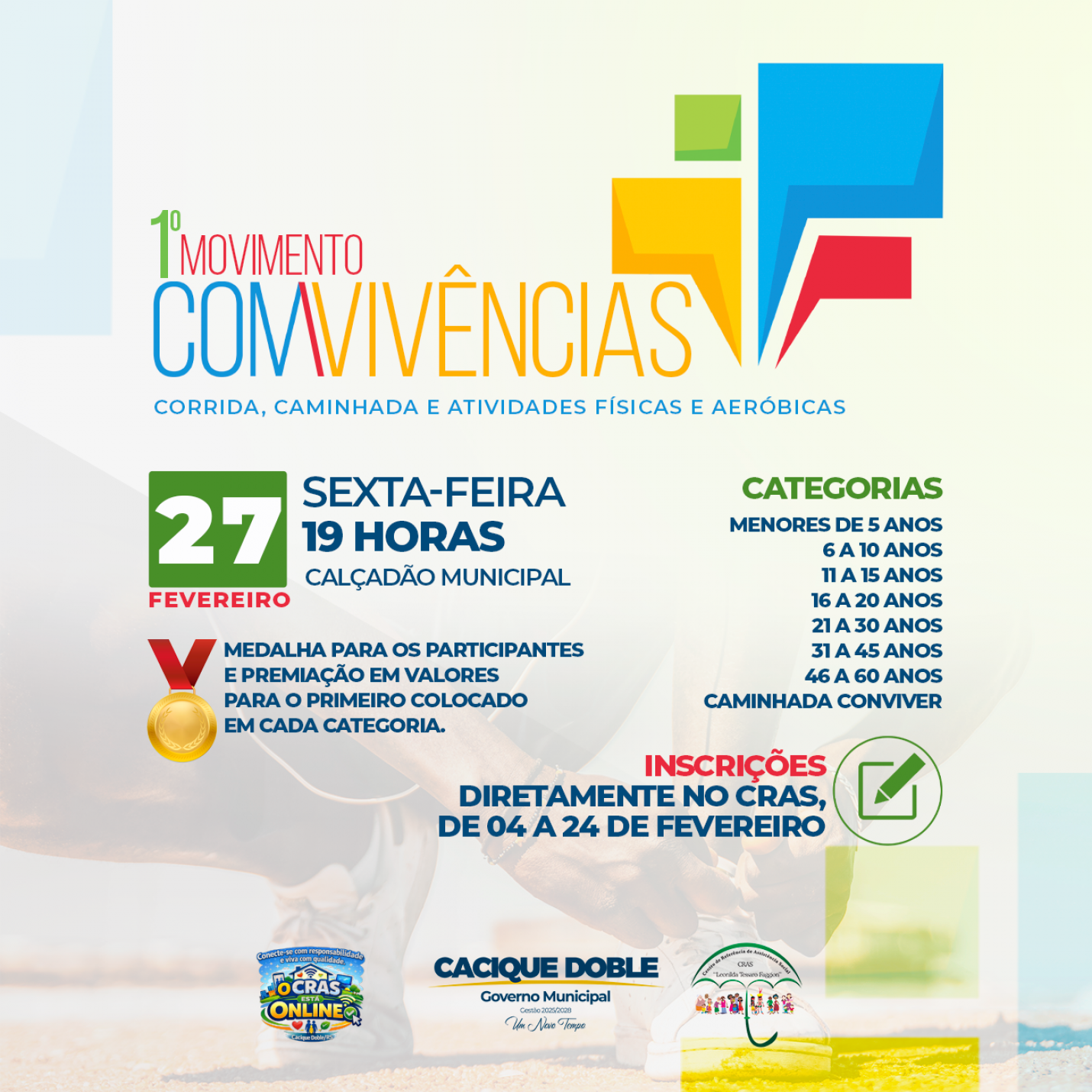 O Governo Municipal de Cacique Doble, por meio da Secretaria de Assistência Social e do CRAS, informa que são os últimos dias para inscrições para a corrida e a caminhada do 1º Movimento Com Vivências, que acontecerá no dia 27 de fevereiro, às 19h, no Calçadão Municipal. A ação integra o projeto “Conecte-se com responsabilidade, viva com qualidade” e tem como objetivo incentivar hábitos saudáveis, convivência e qualidade de vida.