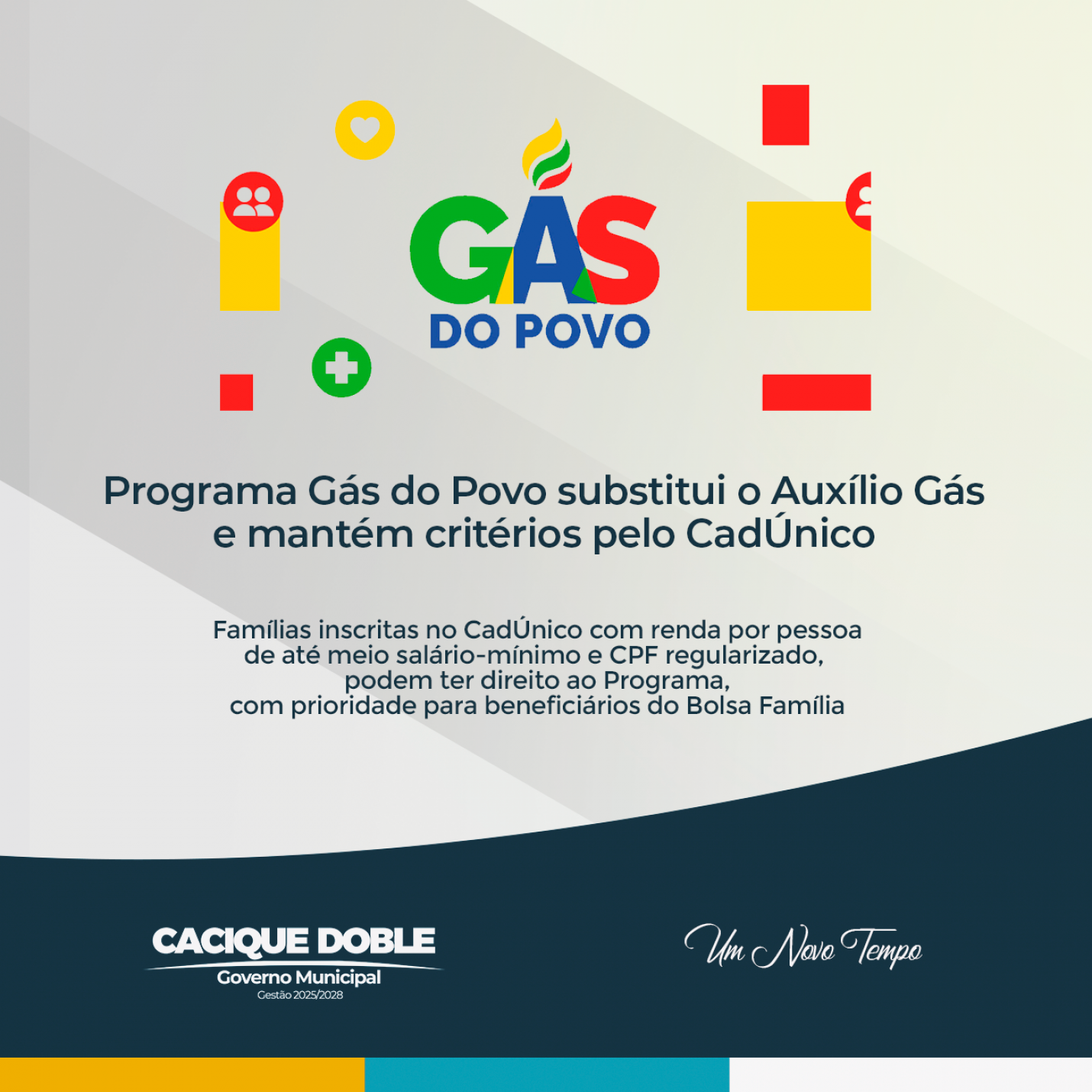 O benefício federal anteriormente conhecido como Auxílio Gás ou Vale Gás passa a ser denominado Programa Gás do Povo. A iniciativa tem como finalidade garantir apoio às famílias de baixa renda para a aquisição do botijão de gás de cozinha. Para ter direito ao programa, a família deve estar inscrita no Cadastro Único (CadÚnico), com dados atualizados, e possuir renda familiar per capita mensal igual ou inferior a meio salário-mínimo.