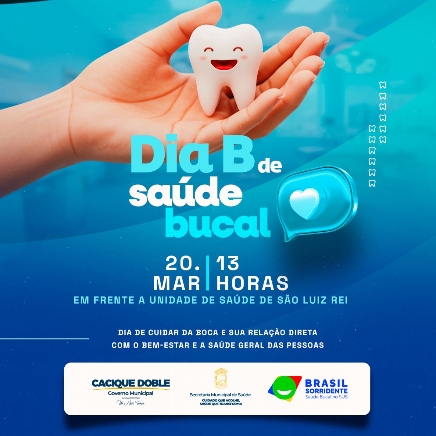 A iniciativa será realizada pela equipe de Saúde Bucal da ESF São Luiz Rei, dentro da mobilização nacional conhecida como “Dia B de Saúde Bucal”, que busca reforçar a importância dos cuidados com a boca e sua relação direta com o bem-estar e a saúde geral das pessoas.