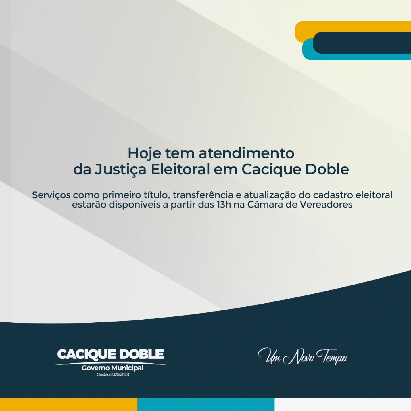 O atendimento acontece a partir das 13h, na sede da Câmara Municipal de Vereadores de Cacique Doble, onde os eleitores poderão realizar diversos procedimentos relacionados ao cadastro eleitoral. Entre os serviços disponíveis estão alistamento eleitoral (primeiro título), transferência de domicílio eleitoral, atualização de dados cadastrais e regularização da situação eleitoral, garantindo que os cidadãos estejam aptos a exercer plenamente o direito ao voto nas próximas eleições.