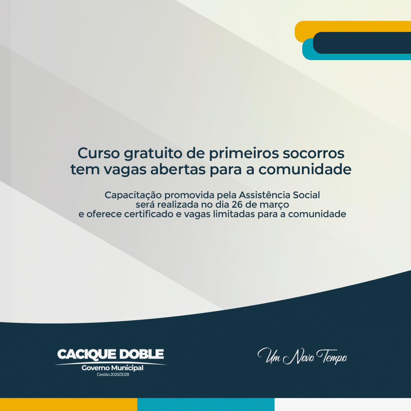 Saber como agir em situações de emergência pode salvar vidas. Pensando na importância do conhecimento em primeiros socorros, a Secretaria de Assistência Social de Cacique Doble está promovendo uma capacitação gratuita voltada à comunidade. O curso de Primeiros Socorros será realizado no dia 26 de março, das 13h às 17h, no Lions Clube.