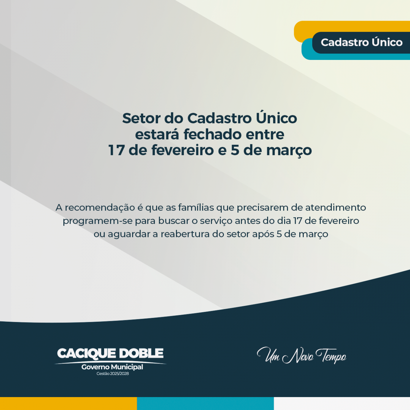 A Prefeitura de Cacique Doble, por meio da Secretaria de Assistência Social, informa que o setor do Cadastro Único estará fechado temporariamente no período de 17 de fevereiro a 5 de março. Durante esse período, não haverá atendimento para novos cadastros, atualizações ou outros serviços relacionados ao Cadastro Único.