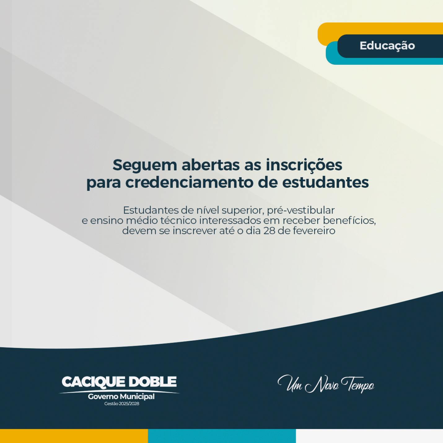 O governo municipal de Cacique Doble, por meio da Secretaria Municipal de Educação, informa que estão seguem abertas as inscrições para o credenciamento de estudantes de nível superior, pré-vestibular e ensino médio técnico interessados em receber benefícios concedidos pelo município. O período de inscrições segue até o dia 28 de fevereiro.