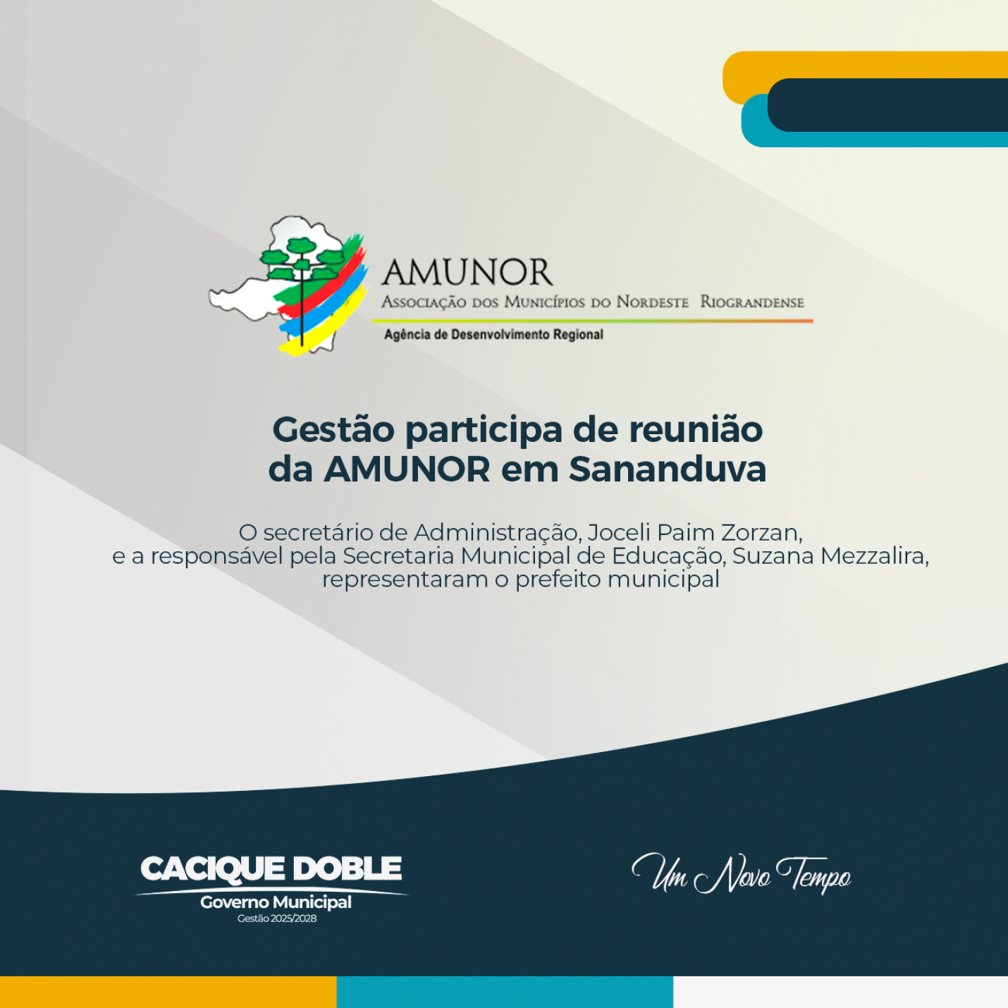 Representando o prefeito de Cacique Doble, o secretário de Administração, Joceli Paim Zorzan, e a responsável pela Secretaria Municipal de Educação, Suzana Mezzalira, participaram da reunião da Associação dos Municípios do Nordeste Riograndense (AMUNOR), nesta terça-feira, dia 18 de fevereiro. O encontro foi realizado no município de Sananduva e reuniu lideranças regionais para debater temas de interesse dos municípios integrantes da associação.