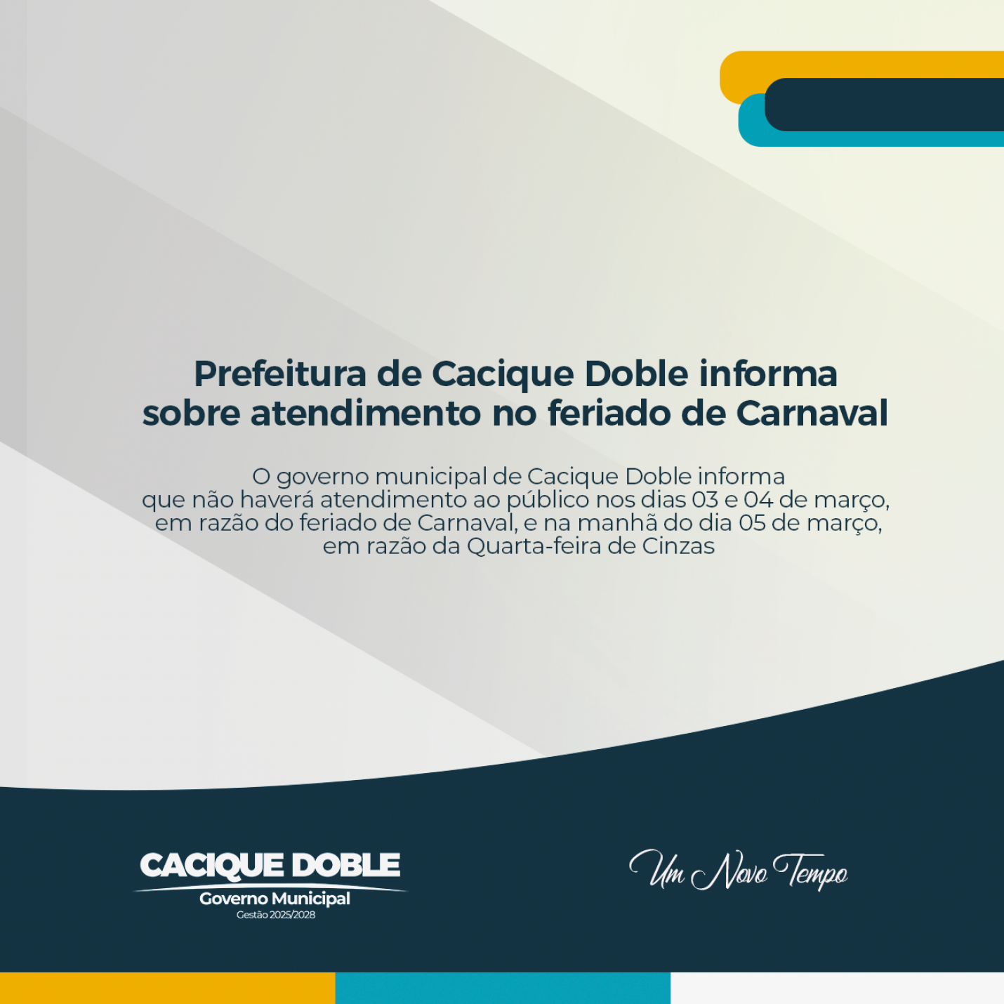 O governo municipal de Cacique Doble informa que não haverá atendimento ao público nos dias 03 e 04 de março, em razão do feriado de Carnaval, e na manhã do dia 05 de março, em razão da Quarta-feira de Cinzas. O retorno das atividades ocorrerá na quarta-feira, 05 de março, a partir das 13h para organização interna e 13h30min para atendimento ao público.