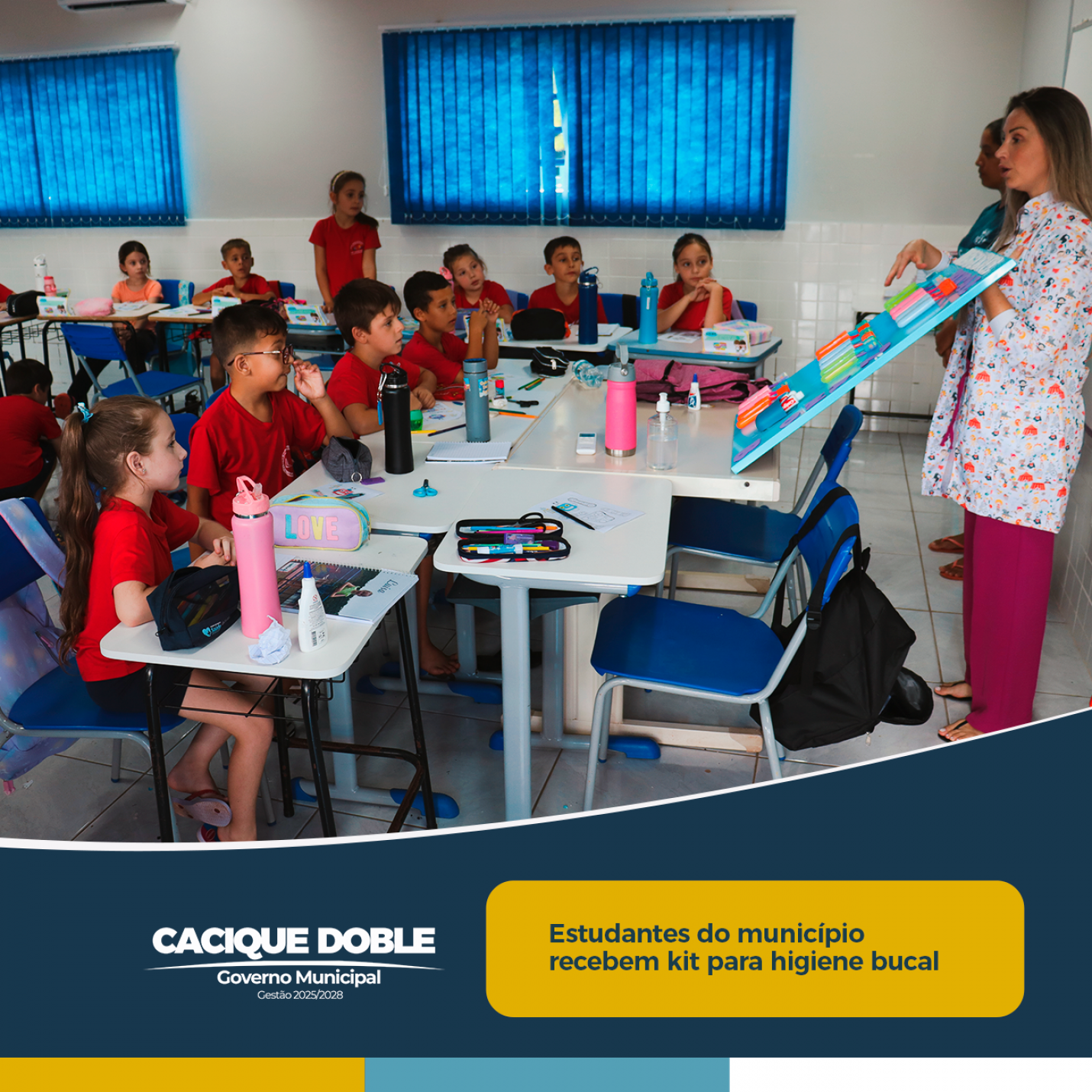 A escola é um espaço privilegiado para práticas de promoção da saúde e de prevenção de doenças, incluindo a higiene bucal de crianças e adolescentes. Para auxiliar na rotina com a saúde bucal, os alunos da Escola Municipal Chapeuzinho Vermelho e o Centro Educacional Susan Fátima Fantin, receberam nesta quarta-feira, dia 26 de fevereiro, por meio da Secretaria de Saúde, os porta escovas onde contém escovas devidamente identificadas, creme dental e fio dental.