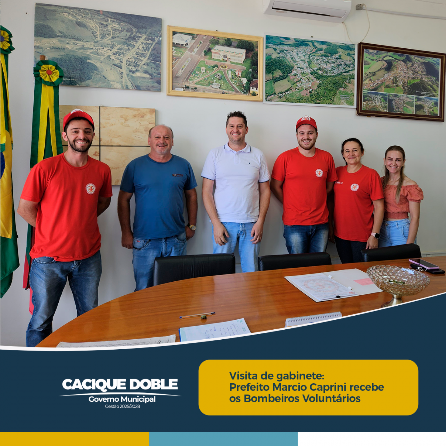 Na manhã desta quinta-feira, 27 de fevereiro, o prefeito Marcio Caprini recebeu em seu gabinete a visita de representantes dos Bombeiros Voluntários de Cacique Doble. O encontro teve como objetivo fortalecer o diálogo entre a corporação e o poder público, garantindo uma parceria cada vez mais efetiva no atendimento à população.