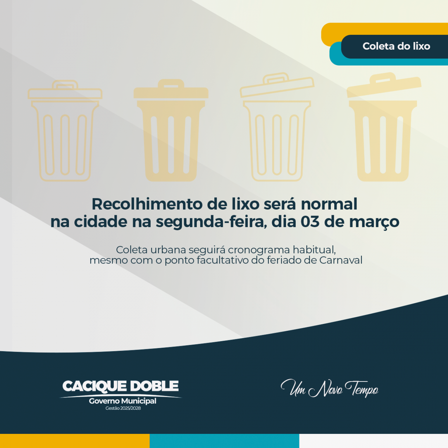 O Governo Municipal de Cacique Doble informa à comunidade que o recolhimento de lixo ocorrerá normalmente na próxima segunda-feira, dia 03 de março. Embora seja ponto facultativo no atendimento ao público em razão do feriado de Carnaval, as equipes responsáveis pela coleta seguirão o cronograma habitual, garantindo a limpeza e organização da cidade.