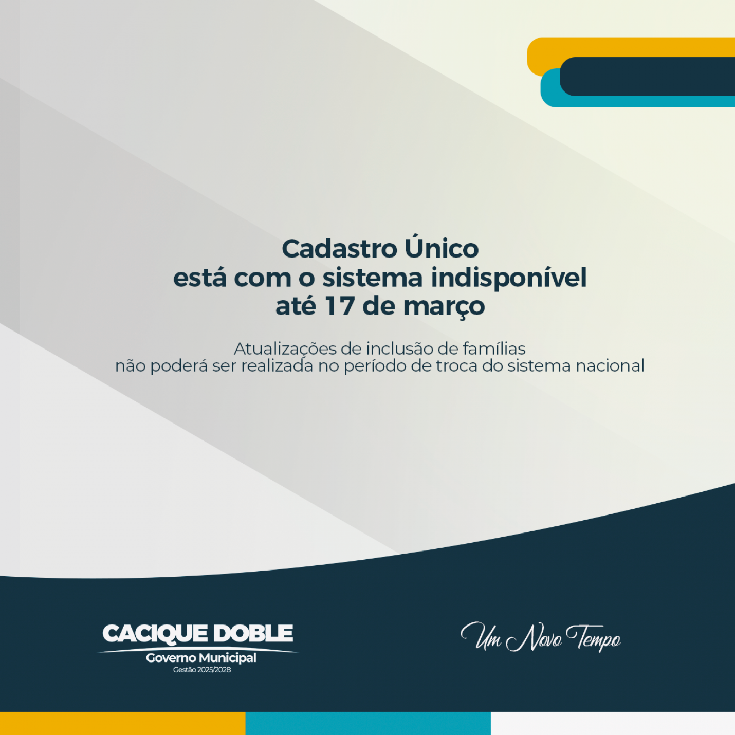 A Secretaria de Assistência Social informa que o sistema de atualização do Cadastro Único segue temporariamente indisponível até o dia 17 de março, devido à troca do sistema nacional. Durante esse período, todos os municípios do país estarão sem acesso para realizar atualizações cadastrais e inclusão de novas famílias.
