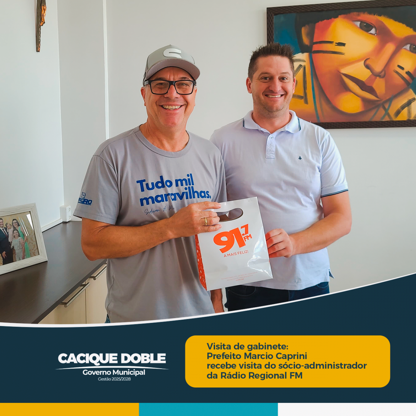 O prefeito Marcio Caprini recebeu a visita de gabinete de Sidimar Antonio Piva, sócio-administrador da Rádio Regional FM 91.7 de Cacique Doble, na tarde desta segunda-feira, dia 10 de março. Durante o encontro, Sidimar reforçou o compromisso da emissora com a comunidade e colocou a rádio à disposição da administração municipal para a divulgação de ações e iniciativas da gestão.