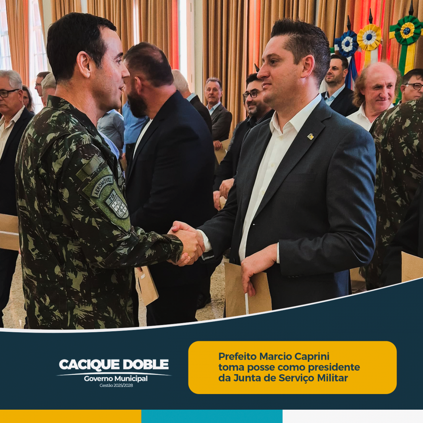 Na manhã desta terça-feira, 11 de março, o prefeito Marcio Caprini tomou posse como Presidente da Junta de Serviço Militar de Cacique Doble. A cerimônia foi realizada no Comando Militar do Sul, em Porto Alegre, contando com a presença de autoridades militares e representantes municipais. A solenidade foi acompanhada pelo secretário de Administração Joceli Paim Zorzan.