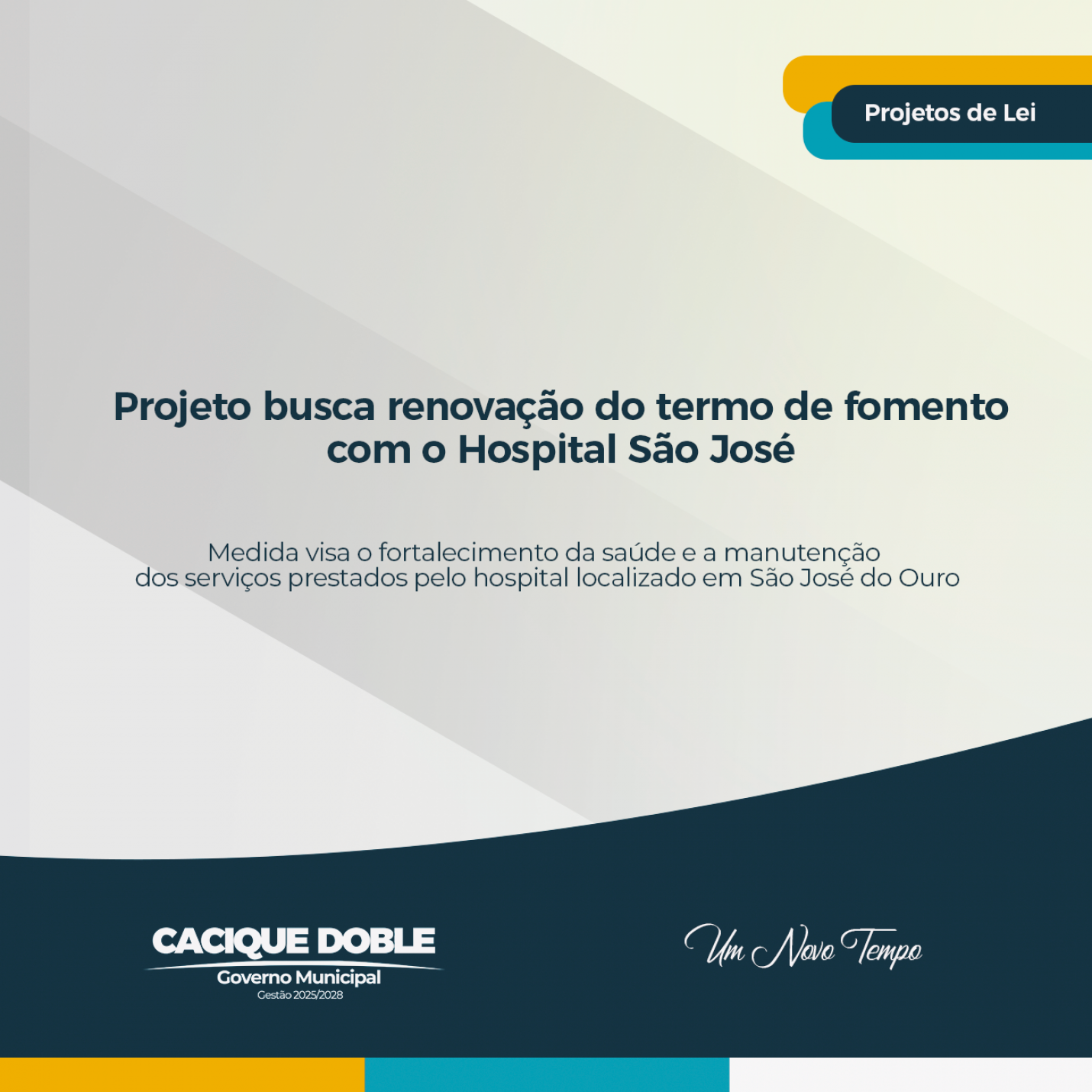 Com o objetivo de garantir a continuidade dos serviços médico-hospitalares prestados à população de Cacique Doble, o prefeito Marcio Caprini, encaminhou à Câmara de Vereadores o Projeto de Lei Nº 016/2025, que autoriza o Poder Executivo a firmar um Termo de Fomento com a Fundação Araucária – Hospital São José, localizada em São José do Ouro.
