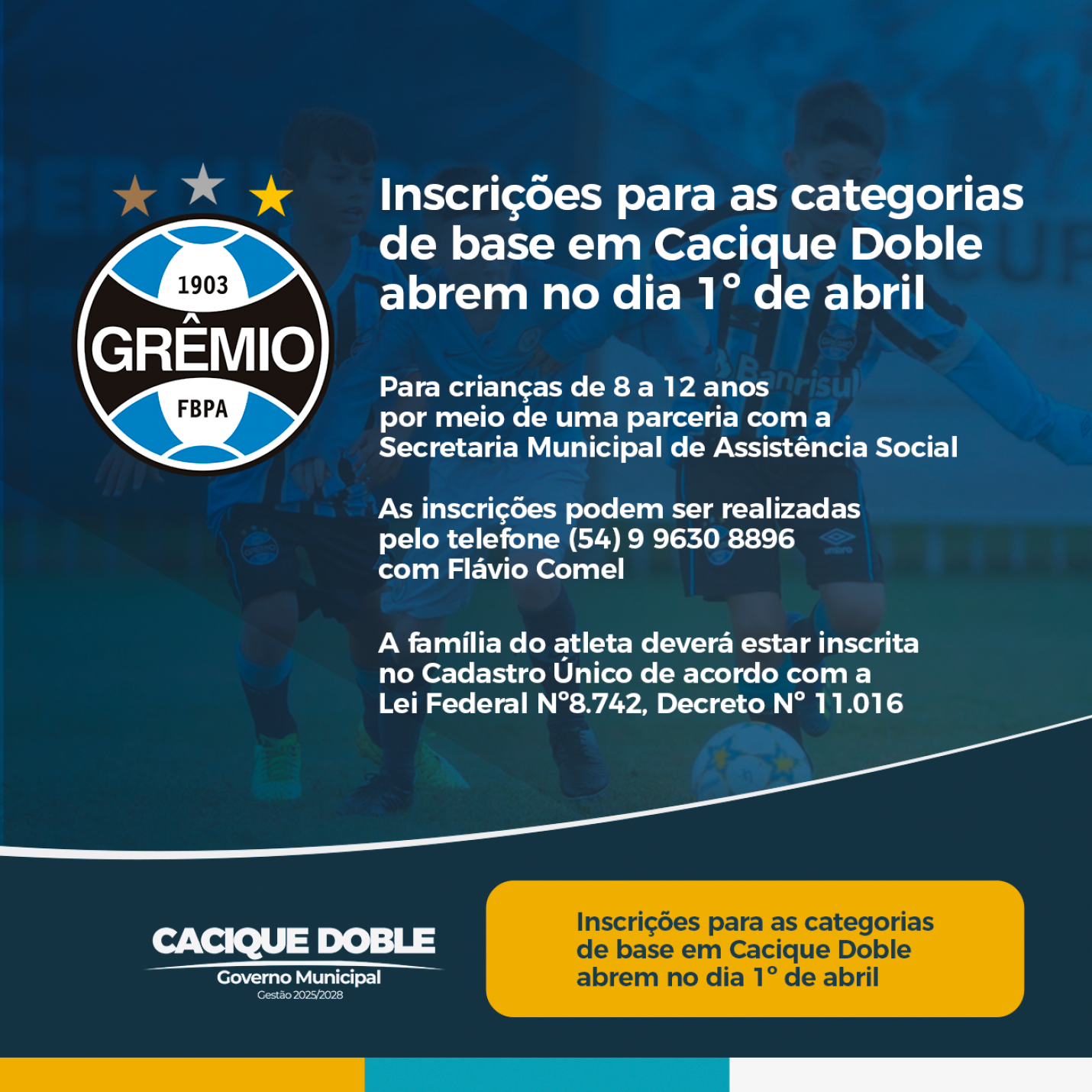 As inscrições para a base do futebol em Cacique Doble, contemplando as categorias Sub-8, Sub-9, Sub-10, Sub-11 e Sub-12 iniciam na terça-feira, dia 1º de abril. Por meio de uma parceria com a Secretaria Municipal de Assistência Social, crianças de 8 a 12 anos devidamente inscritas no Cadastro Único podem participar das aulas, garantindo uma oportunidade de desenvolvimento esportivo e social. O prazo para as inscrições vai até 20 de abril.