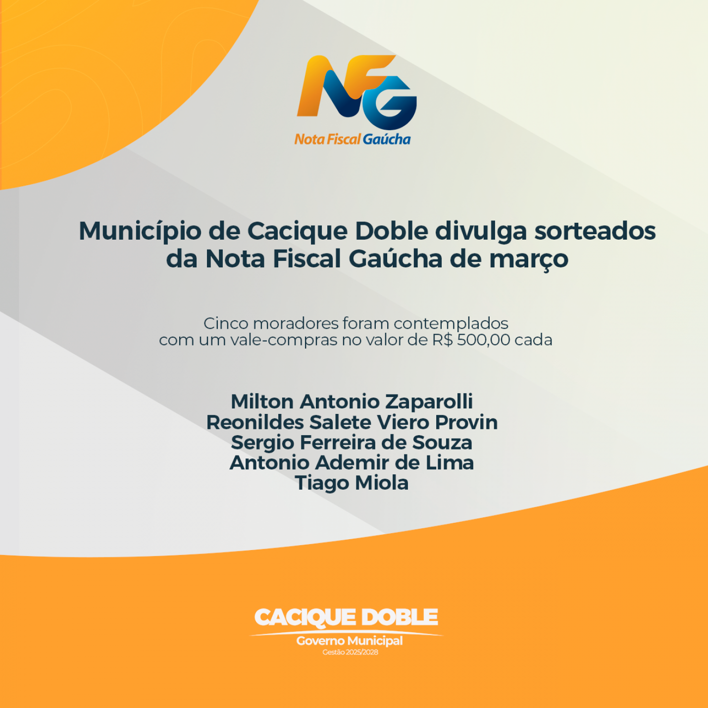 O governo municipal de Cacique Doble divulga os ganhadores do sorteio municipal de março do Programa Nota Fiscal Gaúcha (NFG). O sorteio foi realizado em 27 de março e o resultado preliminar foi encaminhado ao município, sendo que o prêmio pode ser solicitado após a homologação que ocorre 5 dias depois do sorteio. Cinco moradores foram contemplados com um vale-compras no valor de R$ 500,00 cada. Os ganhadores têm um prazo de até 90 dias para realizar o resgate do prêmio.