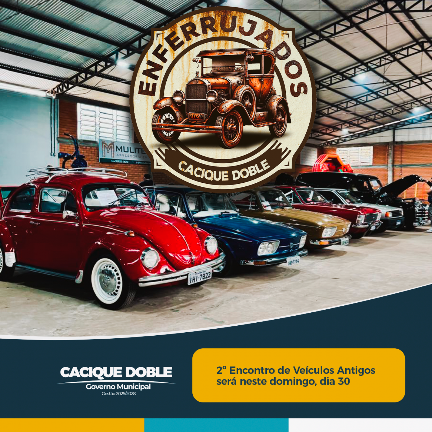Cacique Doble recebe o 2º Encontro de Veículos Antigos, neste domingo, dia 30 de março, no Parque de Eventos Simão Pedro Tonial. O evento, que recebeu fomento do Poder Executivo Municipal, promete reunir mais de 300 veículos vindos de diversas cidades do Rio Grande do Sul e de Santa Catarina, celebrando a paixão pelos clássicos do automobilismo.