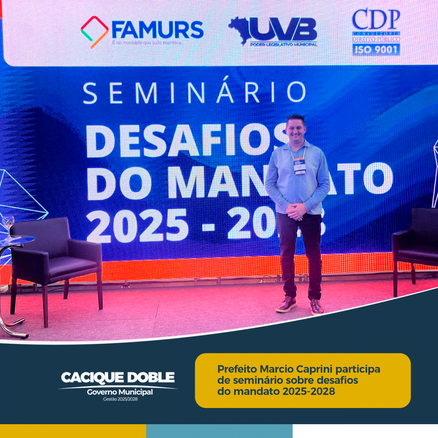 Para se atualizar em temas que são fundamentais para garantir uma gestão eficiente e alinhada com as necessidades da população, o prefeito Marcio Caprini participa do Seminário Desafios do Mandato 2025-2028, promovido pela Famurs. O evento inicou nesta terça-feira, dia 1 de abril e segue na quarta-feira, dia 2 de abril, em Porto Alegre.
