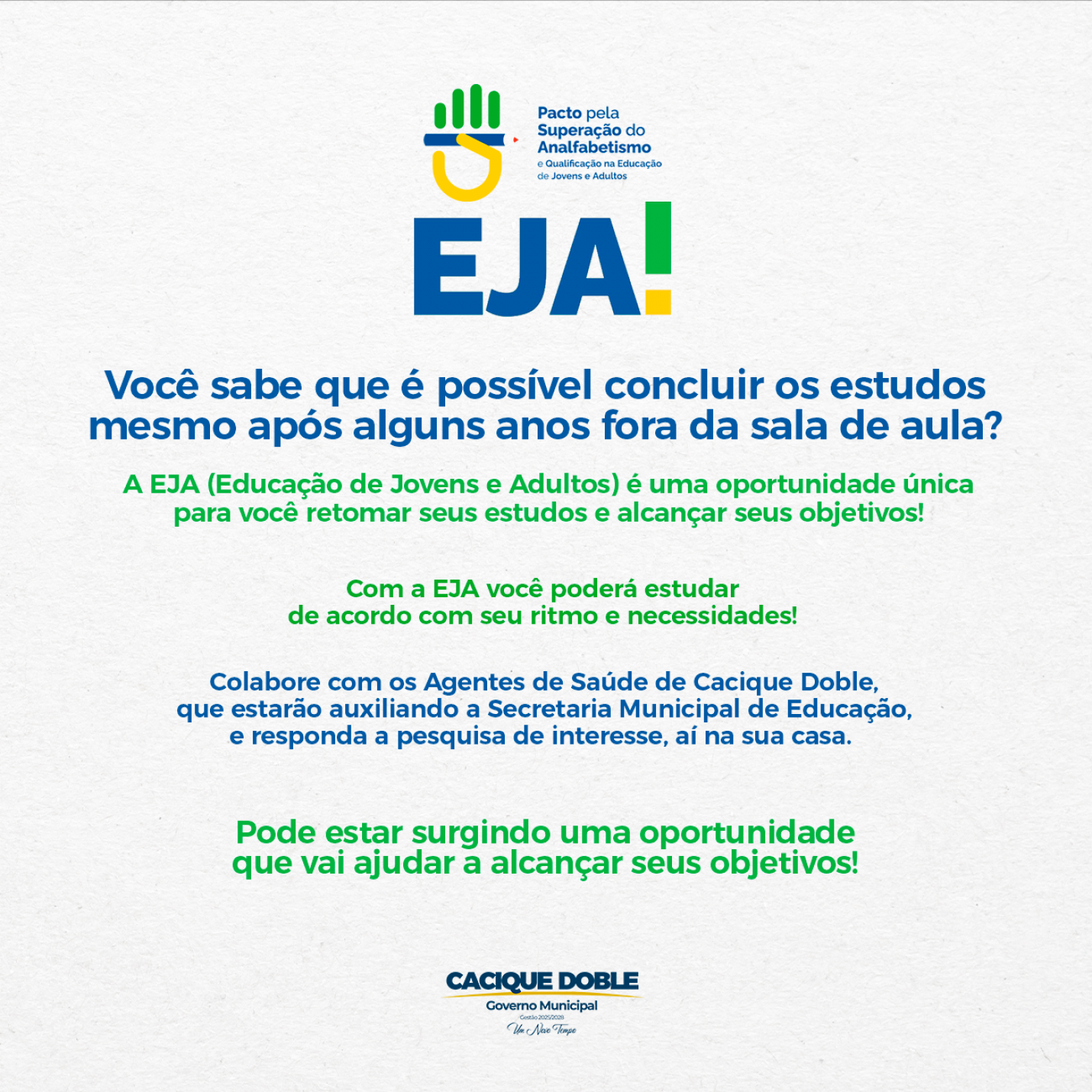 Em Cacique Doble, a Secretaria Municipal de Educação, com o apoio das Agentes Comunitárias de Saúde, está realizando um questionário de interesse para identificar aqueles que desejam participar desta modalidade de ensino, a princípio, com início no segundo semestre de 2025, em locais e turnos a serem definidos.