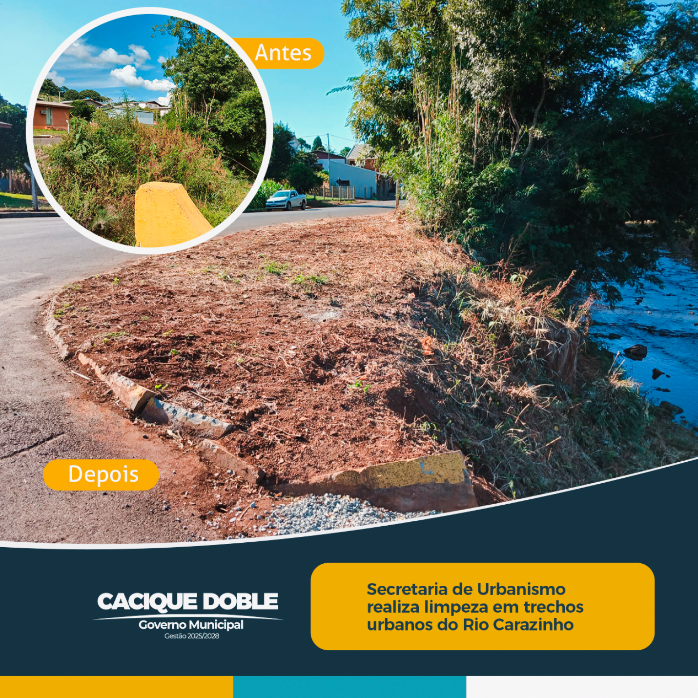 A Secretaria de Urbanismo de Cacique Doble intensificou, nesta semana, os trabalhos de limpeza e revitalização em diferentes pontos da cidade. As ações foram realizadas em dois pontos, nas margens do Rio Carazinho, na Avenida Guarani, na ponte nas proximidades do campo do Internacional e na margem da ponte da Rua Ricardo Zeni com a Rua João Bianchin.