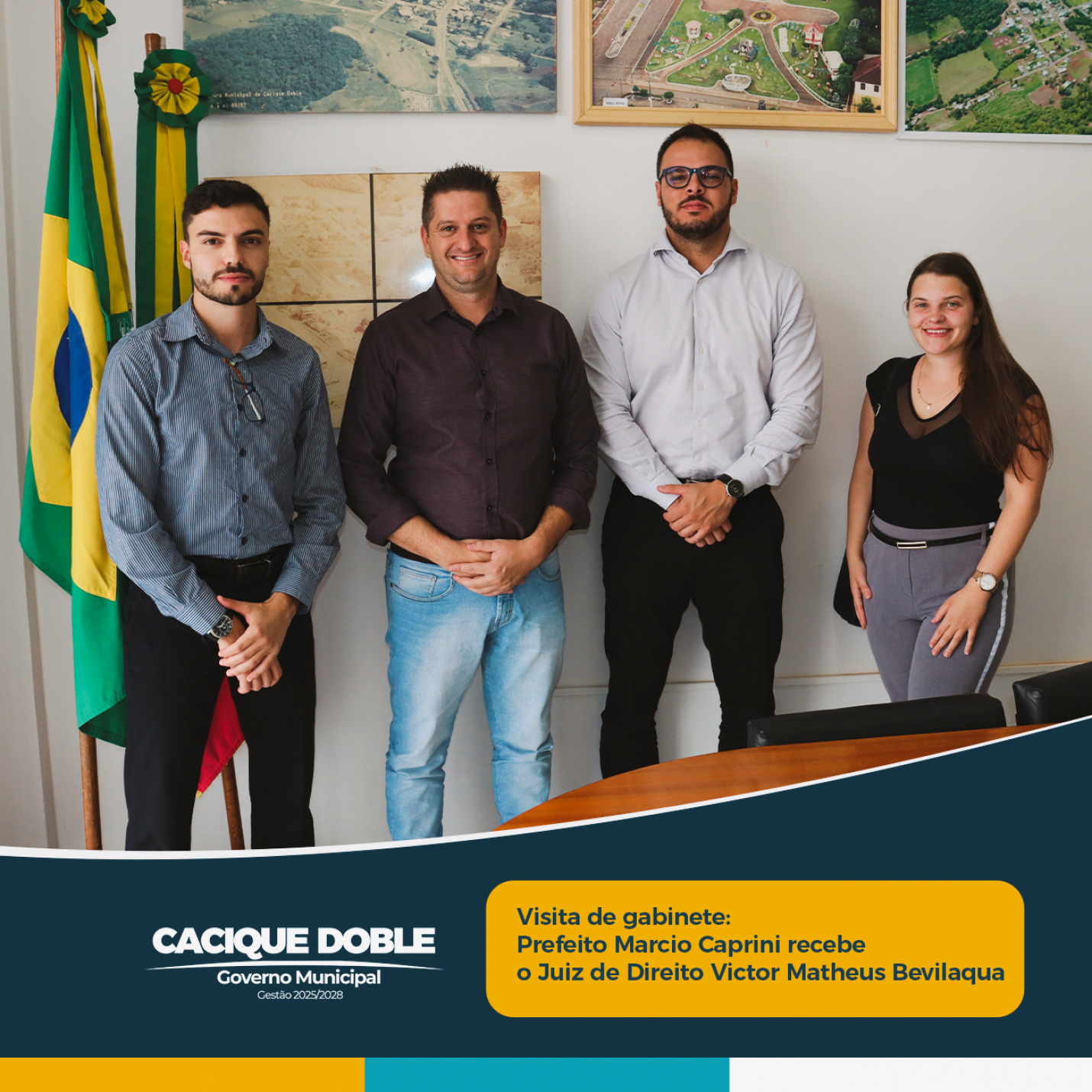 No início da tarde desta quinta-feira, 03 de abril, o prefeito Marcio Caprini recebeu em seu gabinete o Juiz de Direito Victor Matheus Bevilaqua, titular da Comarca de São José do Ouro. A visita teve como objetivo uma apresentação institucional, fortalecendo o diálogo entre o poder Executivo municipal e o Judiciário. Durante o encontro, o magistrado expressou sua gratidão pela acolhida e reafirmou sua disposição para manter um canal aberto de diálogo entre o município e o fórum.