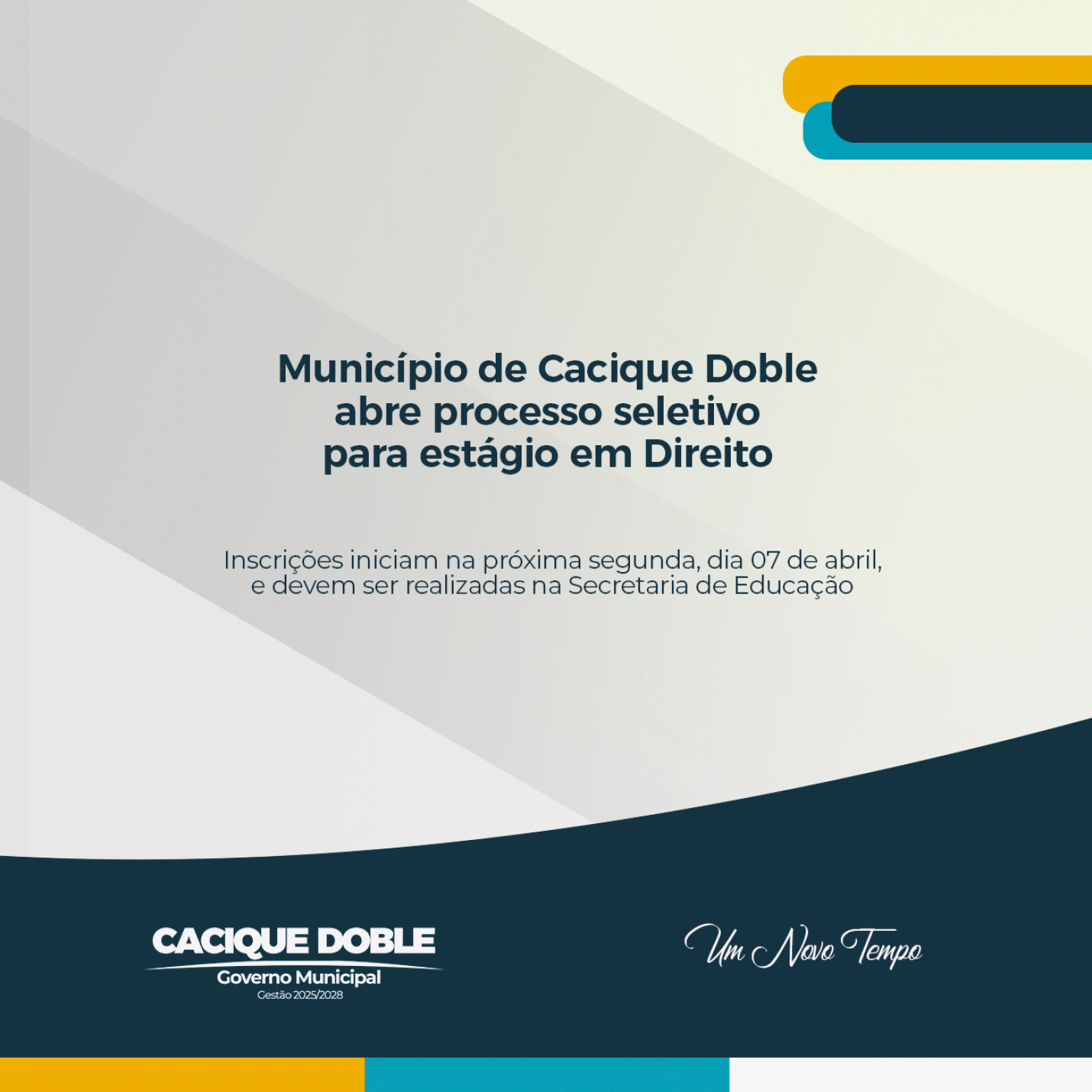 O governo municipal de Cacique Doble publicou nesta quinta-feira, dia 03 de abril, o edital de abertura do Processo Seletivo Simplificado para o preenchimento de vagas de estágio na área de Direito. A seleção se dá exclusivamente para exercício do estágio no Foro da Comarca de São José do Ouro.