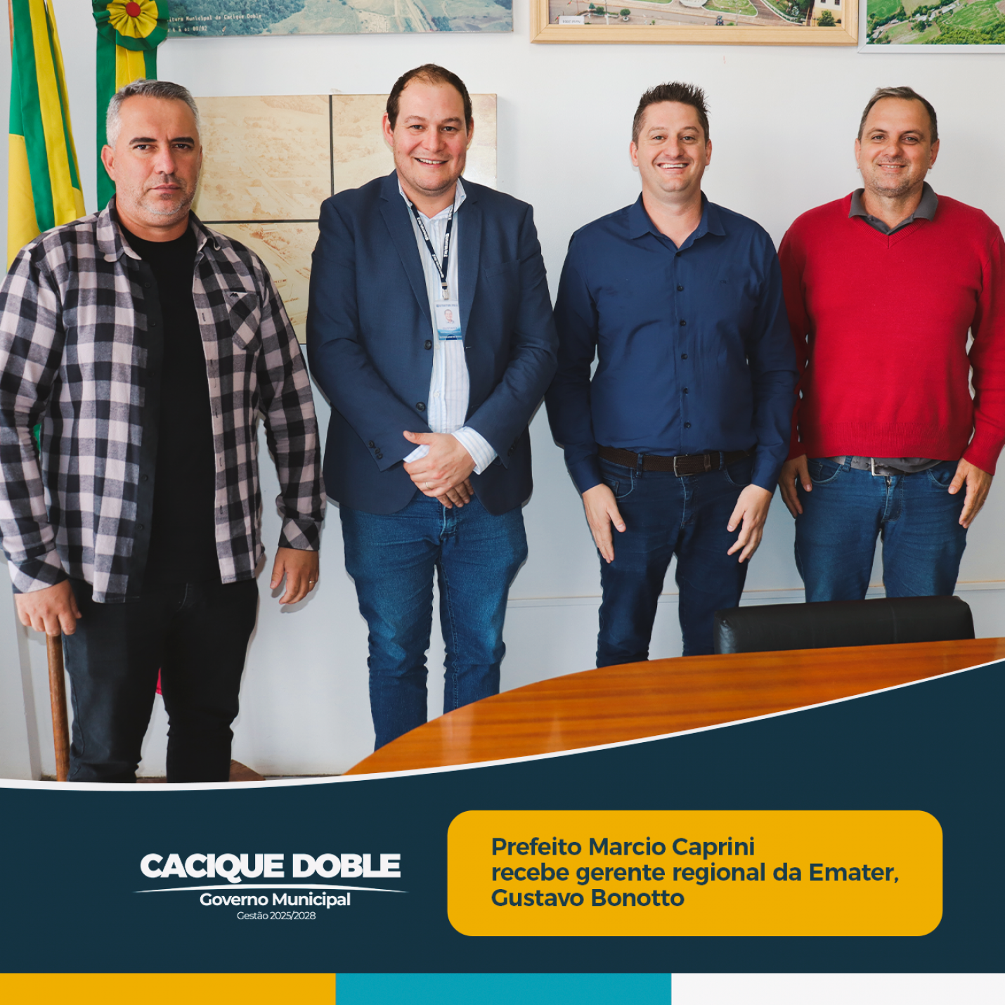 O prefeito de Cacique Doble, Marcio Caprini, recebeu em seu gabinete na manhã desta quinta-feira, 10 de abril, a visita do novo gerente regional da Emater/RS-Ascar, Gustavo Bonotto, ex-prefeito de Lagoa Vermelha. Bonotto assumiu a coordenação regional da Emater no início de 2025 e vem realizando visitas aos municípios da região para fortalecer o diálogo institucional e apresentar os programas desenvolvidos pela entidade.
