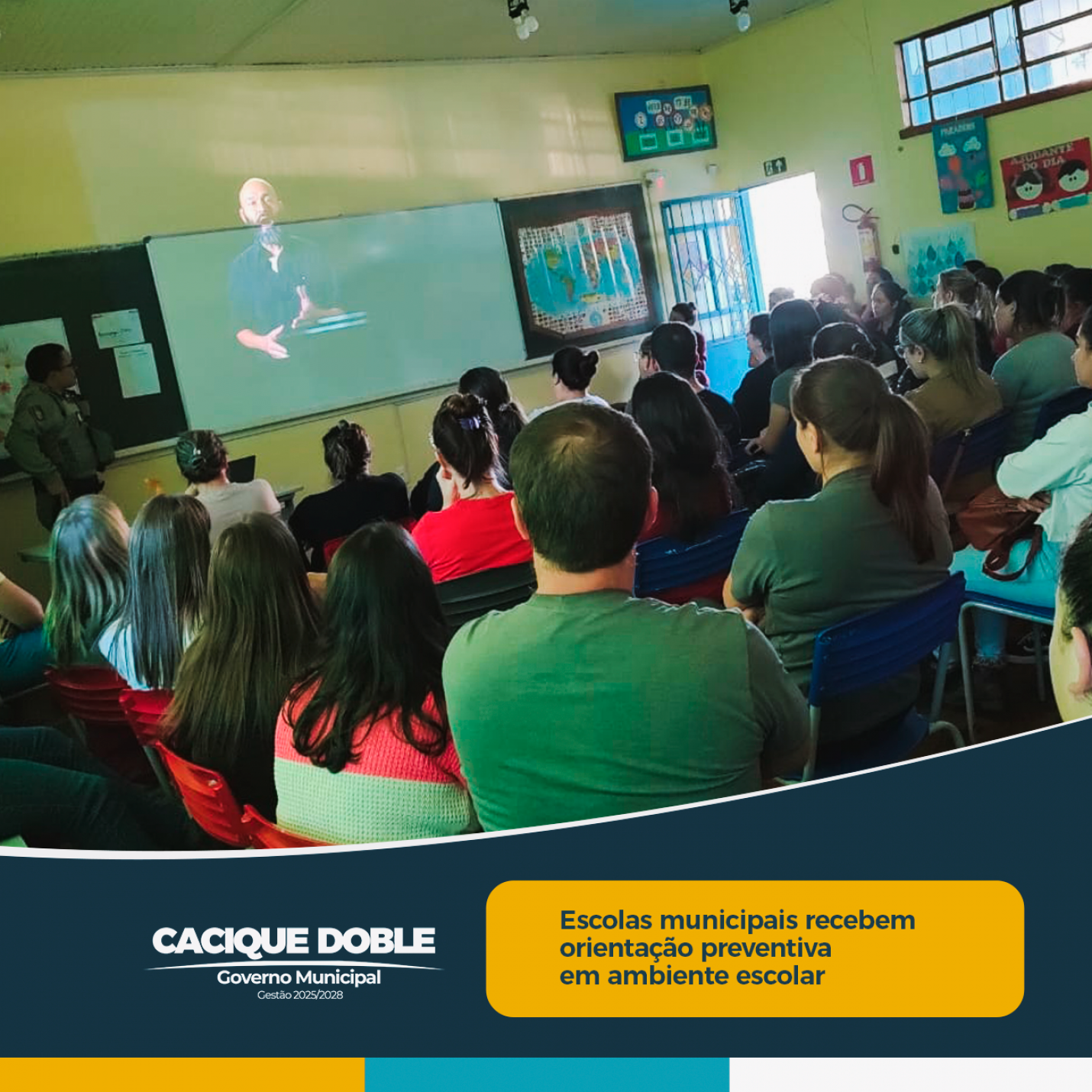 Os profissionais da educação de Cacique Doble participaram de uma importante ação de prevenção e orientação em ambiente escolar, no início da noite desta quinta-feira, 10 de abril. Com o tema “Agressor Ativo em Ambiente Escolar”, a atividade foi ministrada pelos policiais da Brigada Militar Sérgio Hoszczaruk Junior e Maikel Zachi Mioranza, que conduziram uma explanação detalhada sobre protocolos de segurança e medidas preventivas, abordando como agir em situações de emergência.