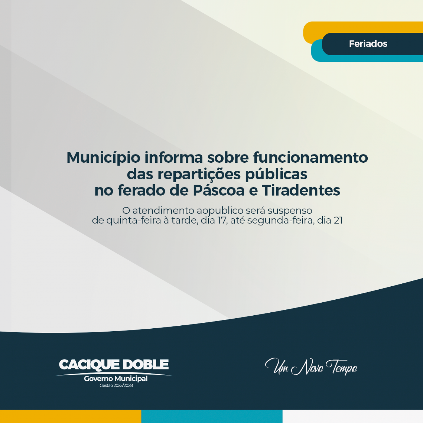 O governo Municipal de Cacique Doble informa que, em razão dos feriados da Páscoa e de Tiradentes, não haverá atendimento ao público nas repartições públicas municipais a partir da tarde de quinta-feira, dia 17 de abril, conforme estabelece a Lei Municipal nº 976/2007, de 19 de dezembro de 2007, que disciplina os pontos facultativos no município.