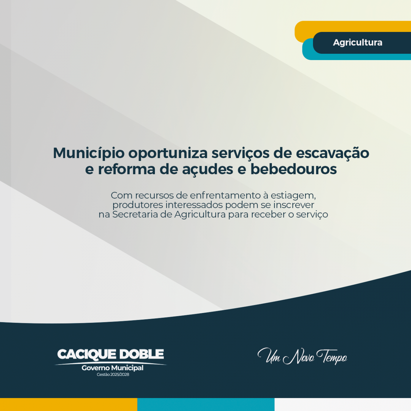 O Governo Municipal de Cacique Doble, por meio da Secretaria de Agricultura, está realizando o cadastro para produtores interessados em serviços de escavação, limpeza, reforma e ampliação de açudes e bebedouros de água para dessedentação animal. A ação faz parte do conjunto de medidas de restabelecimento das condições do meio rural após os efeitos da estiagem que afetou o município.
