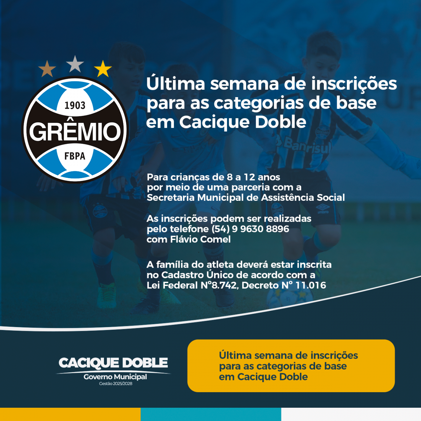 Com subsídio do município, crianças de 8 a 12 anos devidamente inscritas no Cadastro Único poderão participar das aulas das equipes de base do futebol em Cacique Doble, nas categorias Sub-8, Sub-9, Sub-10, Sub-11 e Sub-12. Para efetivar a inscrição, as famílias precisam estar devidamente inscritas no Cadastro Único e o prazo encerra no próximo domingo dia 20 de abril.