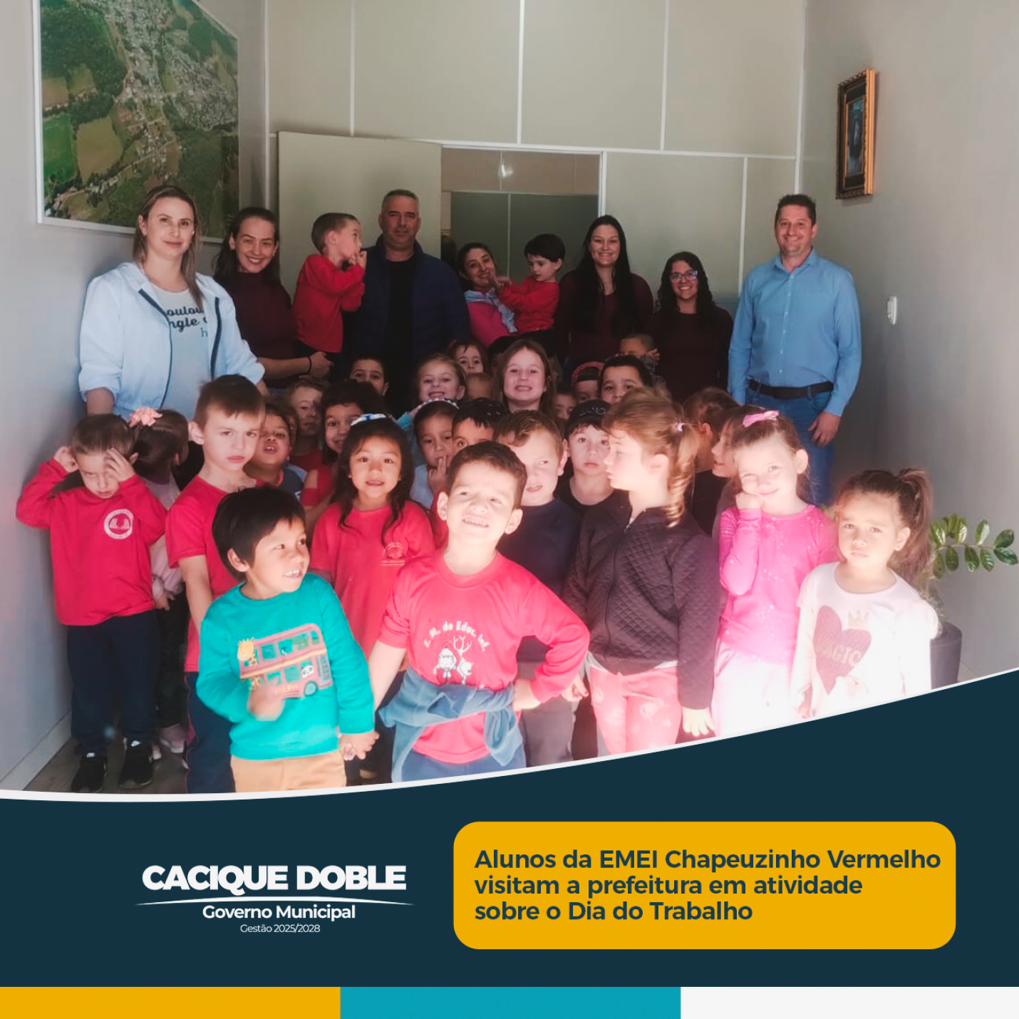 Uma atividade pedagógica em alusão ao Dia do Trabalho, movimentou a Prefeitura Municipal nesta terça-feira, 30 de abril, o prefeito Marcio Caprini recebeu em seu gabinete a visita especial dos alunos da Escola Municipal de Educação Infantil Chapeuzinho Vermelho que visitaram os diferentes setores para conhecer as profissões que fazem parte do serviço público municipal.