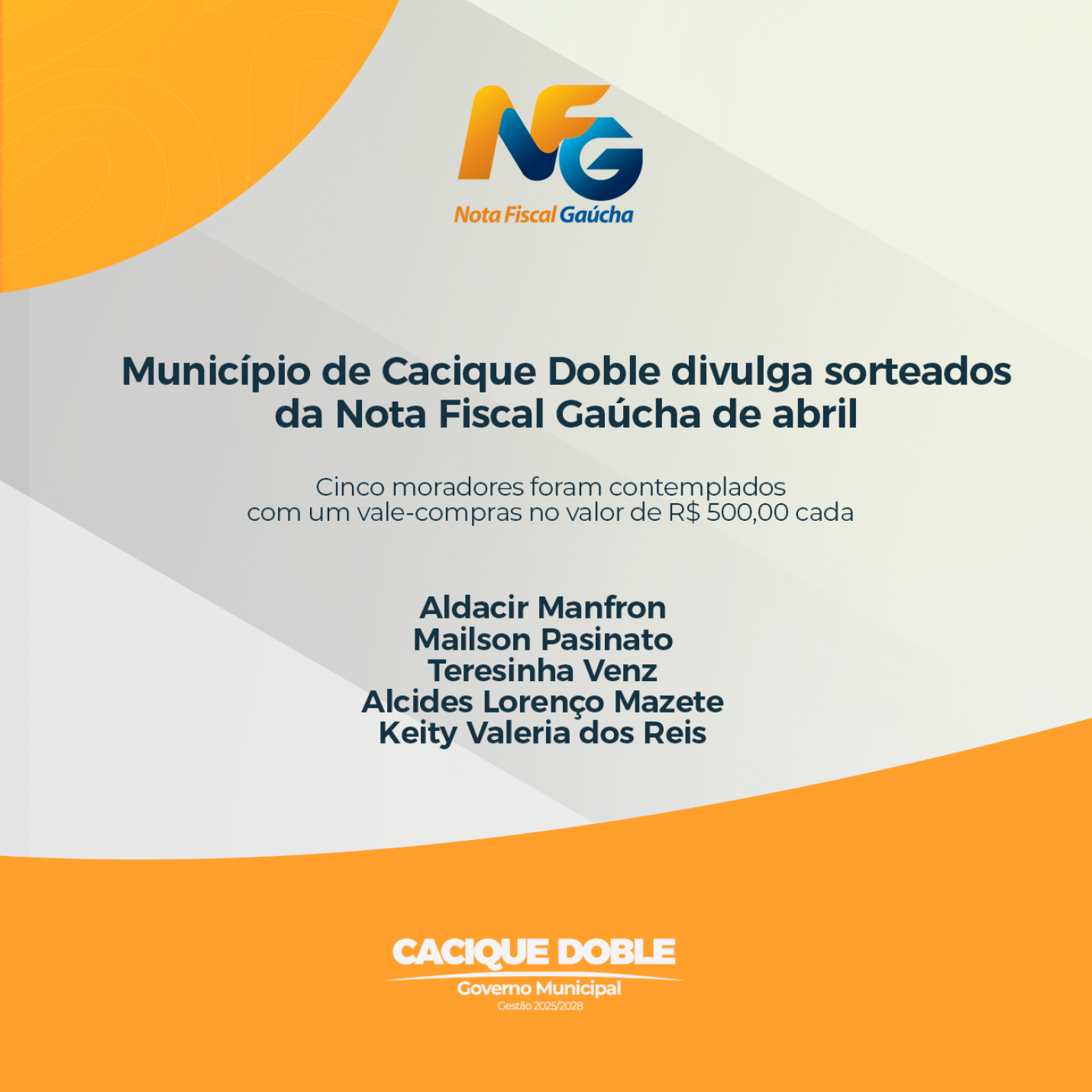 O governo municipal de Cacique Doble divulga os ganhadores do sorteio municipal de abril do Programa Nota Fiscal Gaúcha (NFG). O sorteio foi realizado em 02 de maio e o resultado preliminar foi encaminhado ao município, sendo que o prêmio pode ser solicitado após a homologação que ocorre 5 dias depois do sorteio. Cinco moradores foram contemplados com um vale-compras no valor de R$ 500,00 cada. Os ganhadores têm um prazo de até 90 dias para realizar o resgate do prêmio.