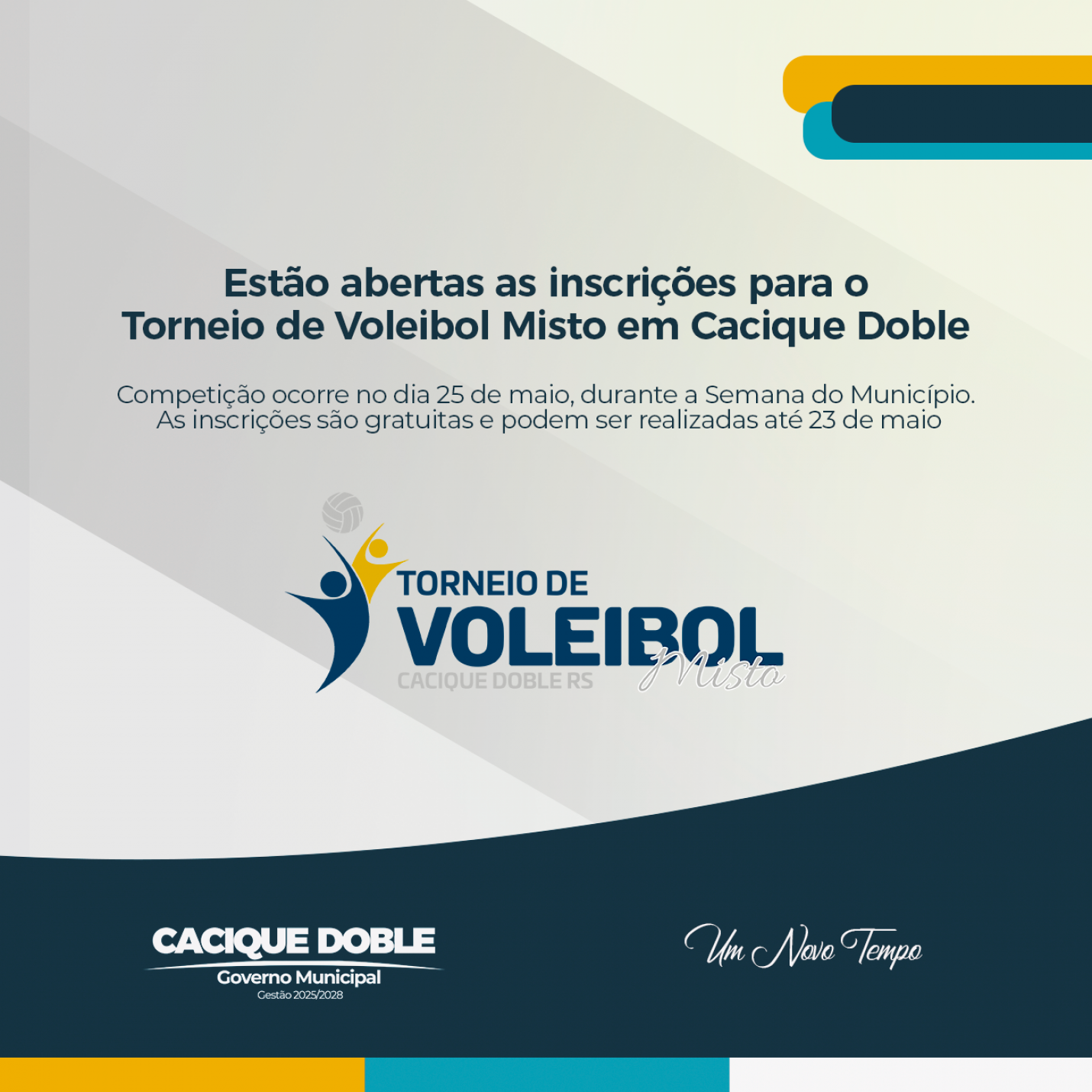 Como parte da programação da Semana do Município, a Secretaria de Educação, Cultura e Desporto de Cacique Doble promove no próximo dia 25 de maio, domingo, o Torneio de Voleibol Misto. O evento será realizado no Ginásio de Esportes, com início às 8h e disputas durante todo o dia.