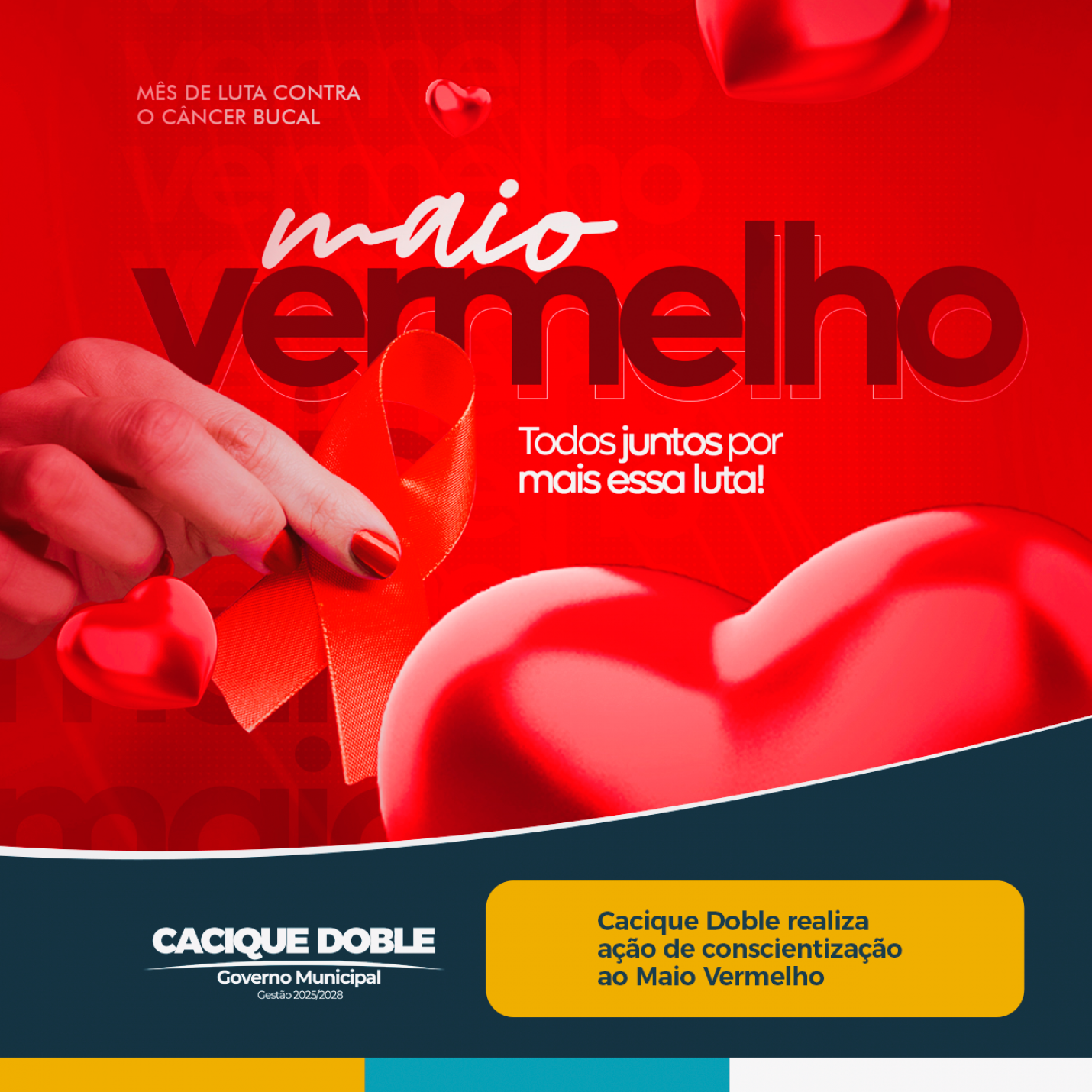 O Maio Vermelho é uma campanha dedicada à prevenção e ao diagnóstico precoce do câncer de boca, um tipo de tumor maligno que, apesar de frequente, ainda é pouco falado. Com o objetivo alertar a população sobre os fatores de risco, a importância de exames preventivos e os cuidados com a saúde bucal, a equipe de saúde bucal da Secretaria Municipal de Saúde de Cacique Doble realiza uma ação especial na próxima sexta-feira, 16 de maio.