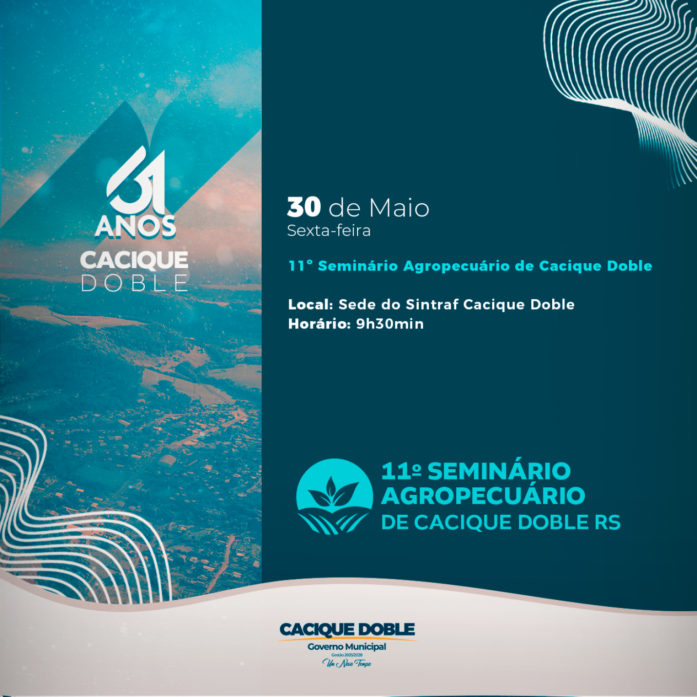 Como parte das comemorações dos 61 anos de emancipação político-administrativa, será realizado na quinta-feira, dia 30 de maio, o 11º Seminário Agropecuário de Cacique Doble. O evento inicia às 9h30min, na sede do Sintraf, e reúne agricultores, técnicos e representantes de entidades voltadas ao desenvolvimento rural.