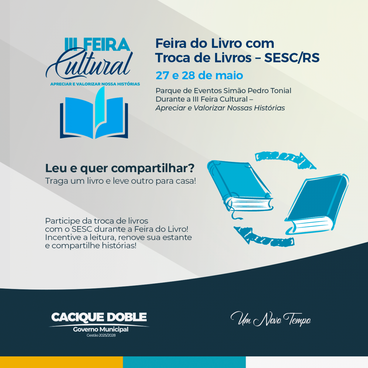 Durante a realização da III Feira Cultural “Apreciar e Valorizar Nossas Histórias”, que acontece nos dias 27 e 28 de maio no Parque de Eventos Simão Pedro Tonial, a comunidade de Cacique Doble poderá participar da troca de livros, promovida em parceria com o Sesc/RS.