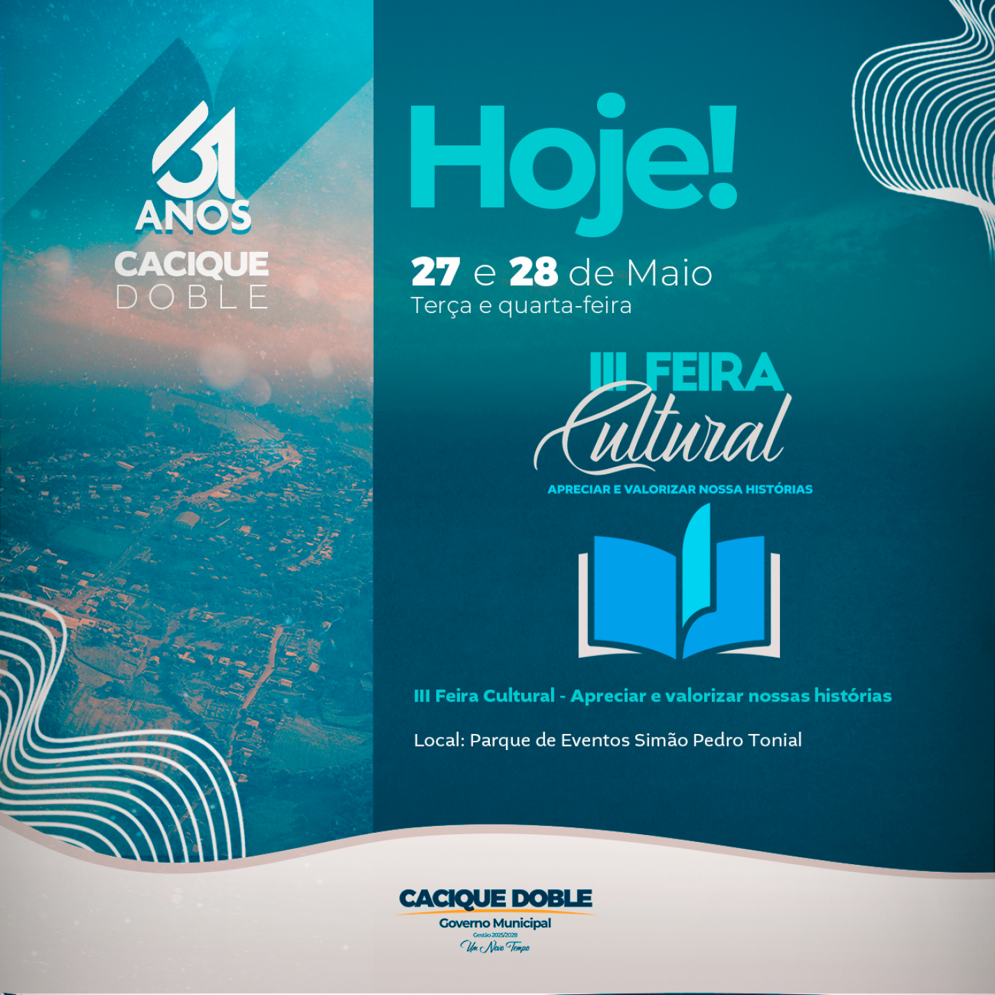 Nesta terça-feira, 27 de maio, tem início a III Feira Cultural – “Apreciar e Valorizar Nossas Histórias”, promovida pela Secretaria de Educação, Cultura e Desporto de Cacique Doble. A abertura oficial acontece às 8h, no Parque de Eventos Simão Pedro Tonial, com presença de autoridades, apresentações culturais, espetáculo teatral do Grupo UEBA, Banda Municipal, grupo de karatê, feira do livro e visitação aos estandes escolares.