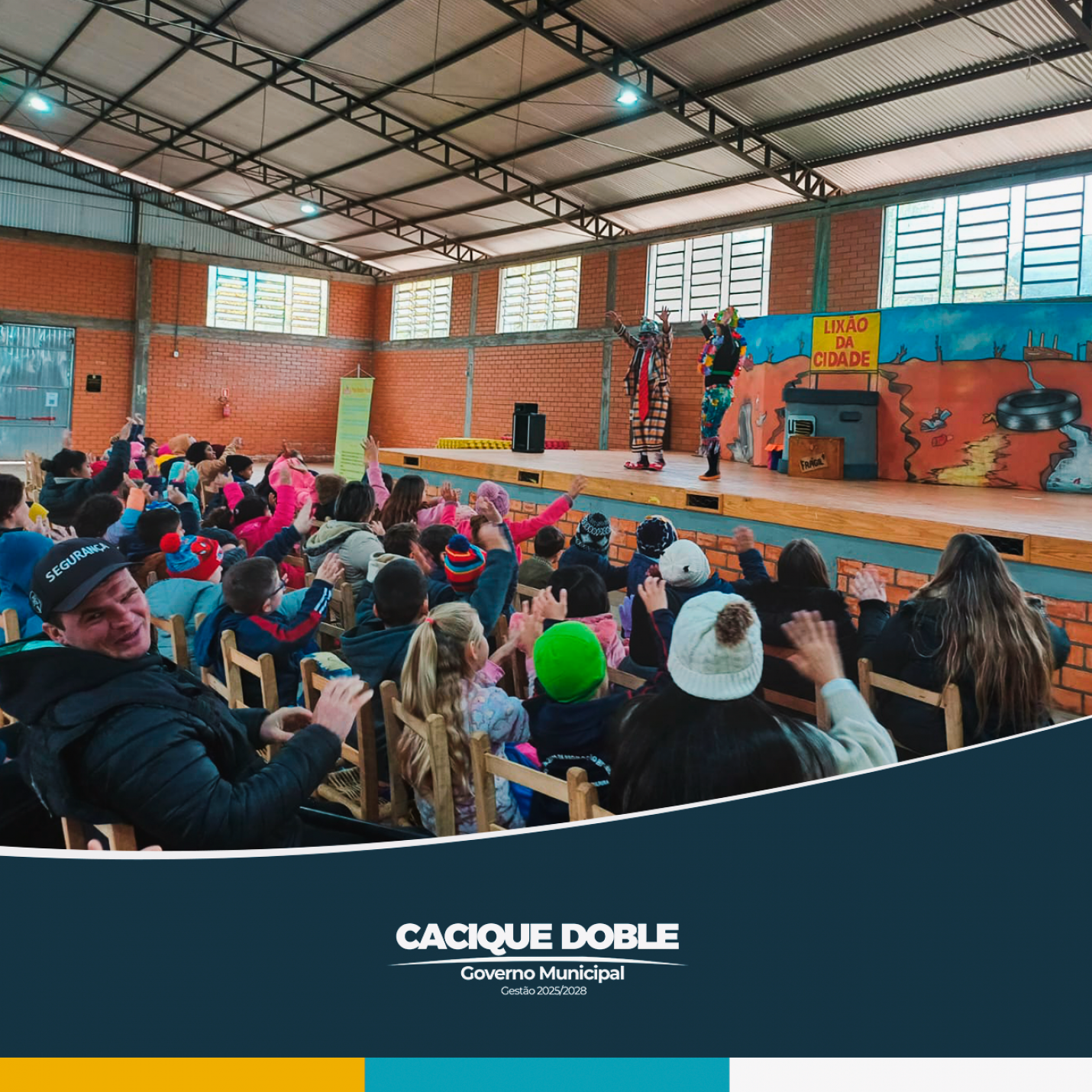 Os alunos de ensino fundamental das escolas municipais de Cacique Doble vivenciaram um momento de arte e educação ambiental com a apresentação do espetáculo “Se Essa Terra Fosse Minha – Coleta Seletiva em Cena”, promovido pelo grupo Fazendo Arte, dentro do projeto “Reciclar é Preciso”. A ação realizada nesta sexta-feira, dia 30 de maio, contou com sessões em dois turnos: pela manhã, participaram os estudantes do 1º ao 5º ano do Centro Educacional Suzan Fátima Fantin e da Escola Belmiro José Granzotto, e à tarde, foi a vez dos alunos da Escola Ivone Salete Peruzzolo Demartini.