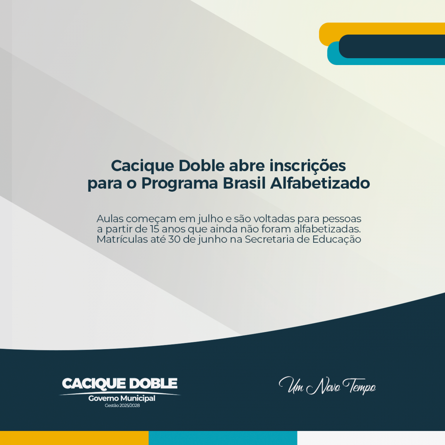 Chegou a oportunidade para quem deseja aprender a ler e escrever: a Secretaria Municipal de Educação de Cacique Doble informa que estão abertas as inscrições para o Programa Brasil Alfabetizado (PBA) – Ciclo 2025, uma iniciativa do Governo Federal com o objetivo de oferecer alfabetização gratuita para jovens, adultos e idosos que ainda não tiveram a oportunidade de aprender a ler e escrever.