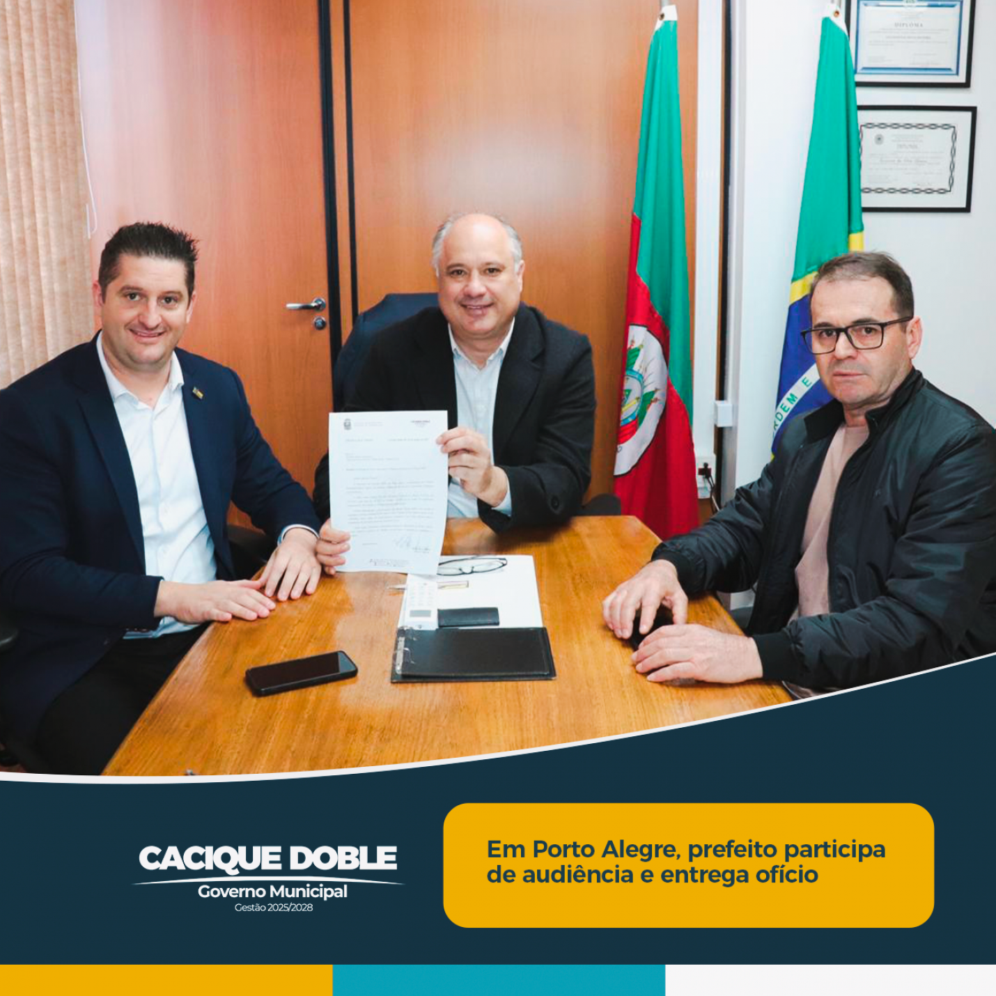 No gabinete do deputado estadual Luciano Silveira, o prefeito entregou um ofício solicitando a liberação de uma nova viatura para a Delegacia de Polícia Civil de Cacique Doble. O ofício informa que a atual viatura, encontra-se em estado de conservação comprometido, dificultando os serviços prestados pela equipe.